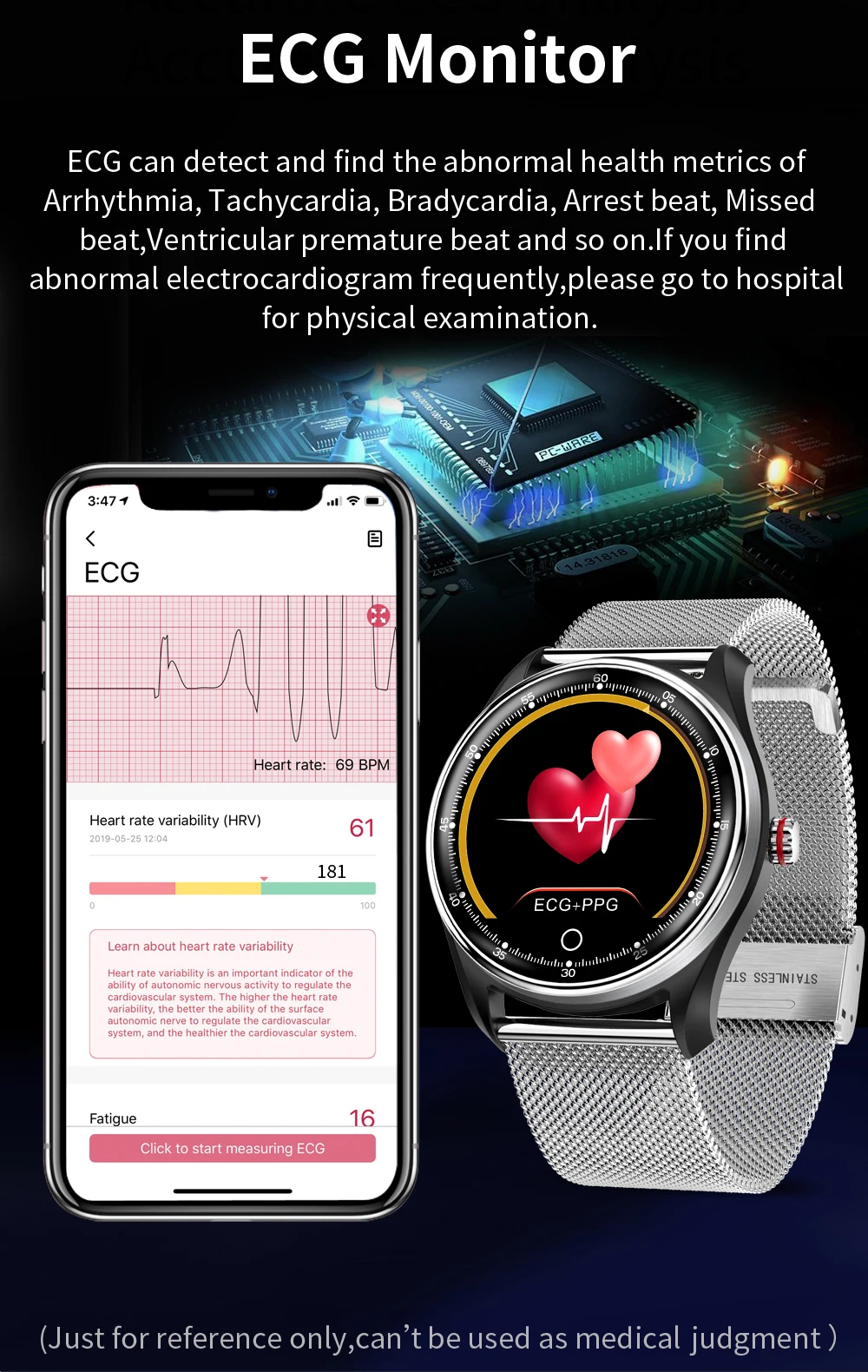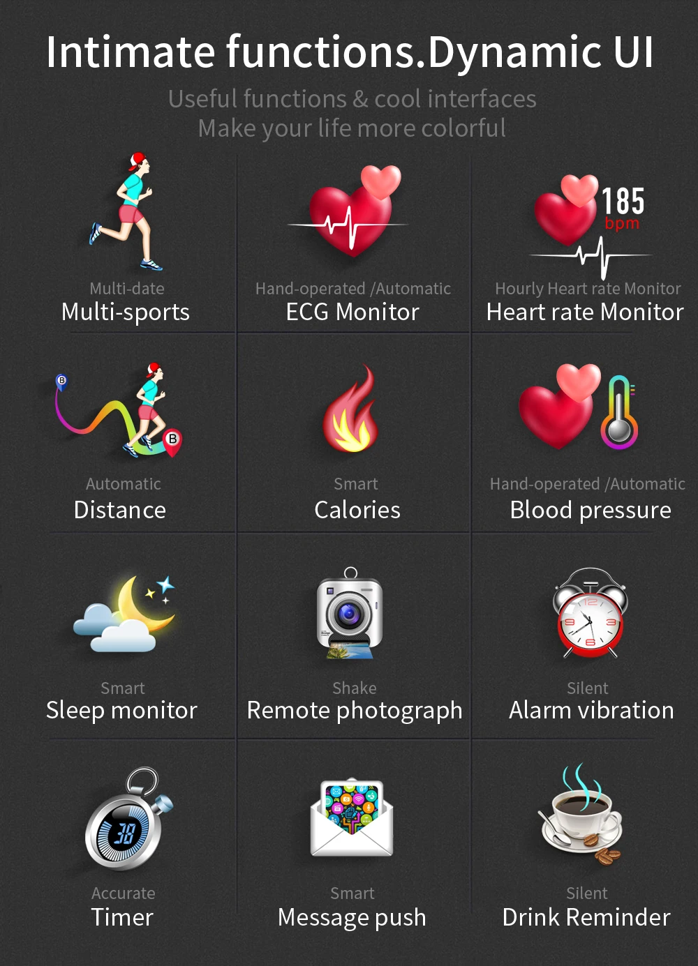 Примечание: 1. Пожалуйста, обратите внимание на совместимую систему: iOS8.2 версия выше и Android 4,4 версия выше смартфона, Bluetooth 4,2 2. Продукт сопровождается инструкциями, пожалуйста, внимательно прочитайте его. 3. По любым вопросам, пожалуйста, свяжитесь с нами, мы предоставим вам удовлетворительное решение в течение 24 часов (за исключением наших праздников) 4. После получения часов, пожалуйста, зарядите сначала. Потому что после длительного периода логистики часы имеют низкую батарею Перед использованием отсканируйте qr-код в руководстве, чтобы загрузить приложение и подключить его к часам с помощью приложения. 5. Водонепроницаемость IP68 (храните его в воде в течение 30 минут и 2 м подавайте воду и не нажимайте кнопку под водой; Не принимайте душ, так как горячий пар попадет внутрь часов) 6. Носимые устройства отслеживают деятельность человека через электронные датчики, и они находятся на уровне электуоники потребителя. Это нормально для определенных отклонений. Пользователь должен рассматривать данные объективно. Пожалуйста, не сравнивайте с больничным оборудованием для чтения, это не медицинское устройство Основные функции: Мульти экстремальных видов спорта ● Переключение на интерфейс спортивного режима. Нажмите и удерживайте нажатой клавишу, чтобы перейти в режим мульти-спорта, затем нажмите и удерживайте нажатие и время, удерживайте долгое нажатие, чтобы выйти из следующего спортивного режима. Восемь спортивных режимов в настоящее время: бег, ходьба, Велоспорт, баскетбол, футбол, бадминтон, альпинизм, плавание. Крови Давление монитор ● После переключения на этот интерфейс нажмите на вибрацию, чтобы начать тест на кровяное давление. Вибрация снова указывает на конец измерения, и данные измерений будут отображаться снова, указывает конец измерения и будут отображаться данные измерений. Вы также можете начать измерение артериального давления в приложении. Монитор сердечного ритма ● После переключения на этот интерфейс нажмите на вибрацию, чтобы начать тест скорости. Вибрация снова указывает на конец измерения, и данные измерений будут отображаться снова, указывает конец измерения и будут отображаться данные измерений. Вы также можете начать измерение сердечного ритма в приложении ЭКГ и фотоплетизмографический (PPG) • 24-часовой непрерывный мониторинг и анализ поток крови под кожу с зеленым светильник датчик светодиодный светильник, сердечный ритм отображается в режиме реального времени с помощью фото электрическая духовка объема пульсовой волны метод трассировки. Спящий режим ● Он может отображать данные общей продолжительности вашего сна прошлой ночью. Продолжительность мониторинга составляет от 1 до 22:00 дня 2 08:00. Соответствующие данные о состоянии сна будут отображаться после 08:00. Примечание: мониторинг данных о состоянии сна в течение и периода, отличного от указанного выше срока, не будет записан. Напоминание ● Поддержка сигнализации, питья воды, сидения, звонков, SMS (сообщения, QQ, Wechat, Skype, Facebook, Twitter, Line, Whatsapp), напоминания о потере. Часы будут напоминать вам вибрацию. Другое Функция ● Время, удаленная камера, найти браслет, шагомер, вибрационное напоминание, анти-потеря, расчет расстояния, будильник. Секундомер. Приложение Язык ● Китайский, английский, японский, испанский, немецкий, французский, русский, португальск