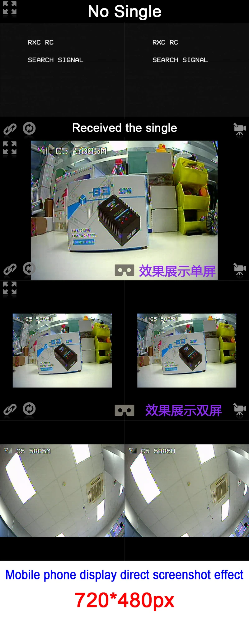Это 5,8G приемник, традиционно принят к экрану, которое передается сотовом телефоне и может быть принят к экрану в одно и то же время .. Используйте питание для мобильного телефона, чтобы упростить проводку и структуру! В сочетании с мощным карманным FPV, это приложение воплощает полет VR!
