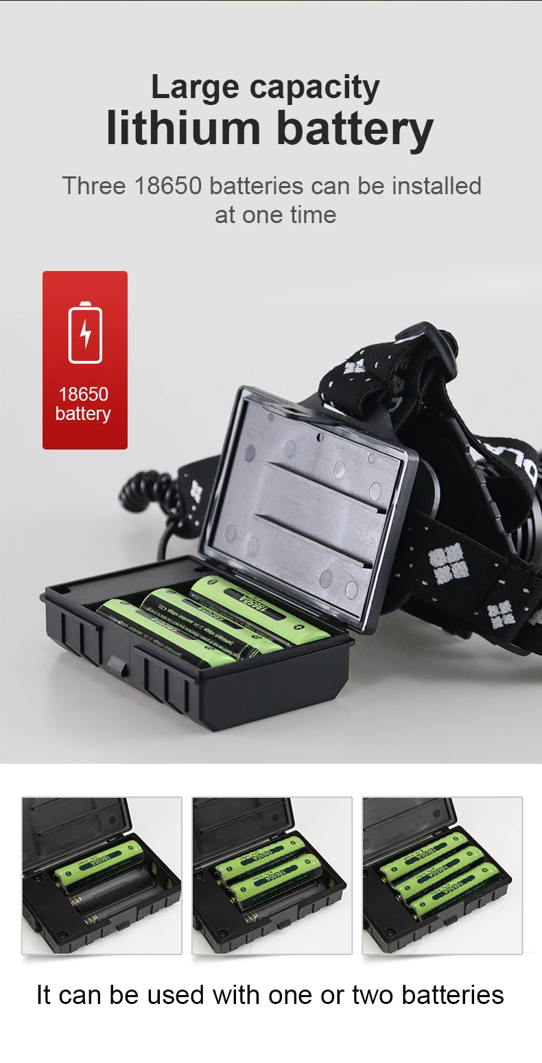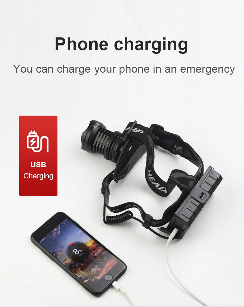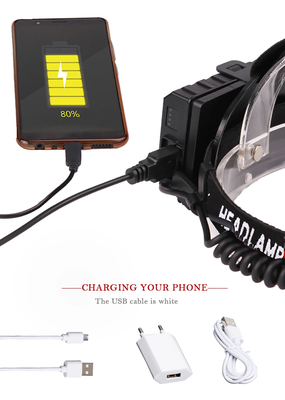 Мощный светодиодный светильник использует новейший светодиодный светильник xhp90.2 с максимальной яркостью 350000 люменов и радиусом облучения 1000 метров3 режима: высокий, низкий, вспышка (легко использовать в различных сценариях)Телескопический зум; Яркий на большие расстояния, четче на близкие расстоянияРегулируемый ремешок для фар, подходит для всех людейЗадний отсек батареи может вместить 3*18650 перезаряжаемые батареи для более длительного срока службыПортативный микро USB вход, подходит для автомобиля/мобильного питания/компьютера/USB разъемВыход USB (5 в 1 а), может использоваться как Мобильная мощность4 уровня отображения мощности (1% ~ 25%, 25 ~ 50%, 50% ~ 75%, 75% ~ 100%)Параметры продукта: