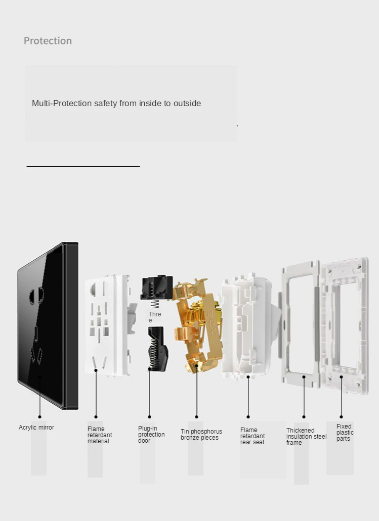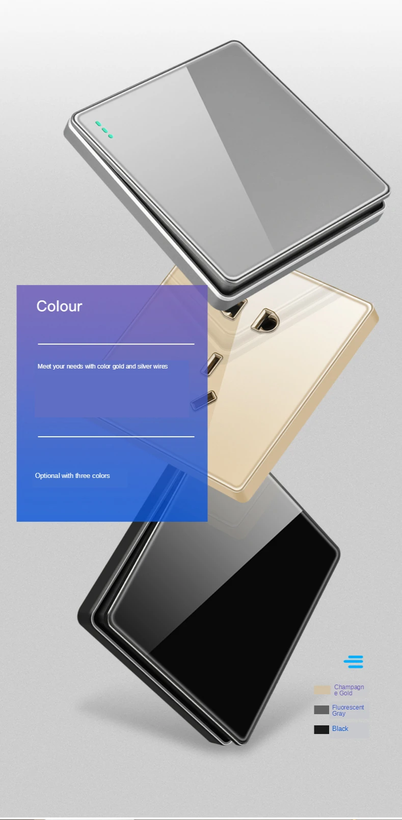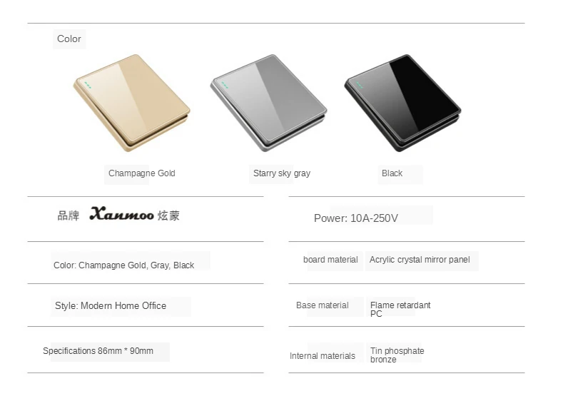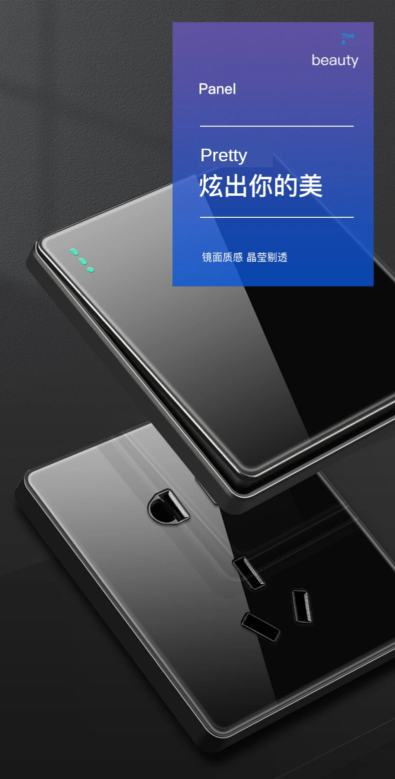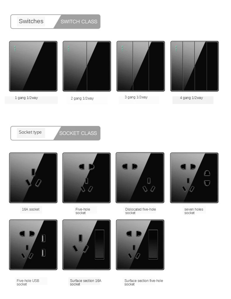Название продукта: набор переключателей из черной акриловой панели толщиной 86 мм Номинальное напряжение: 250 В Номинальный ток: 10А Материал панели: поликарбонат Цвет: черный Расстояние между установочными отверстиями: 60 мм Размер изделия: 86*86 мм Сертификат: CCC Характеристики продукта: серия Black acrylic, модный внешний вид, черная акриловая панель, прочная устойчивость к царапинам