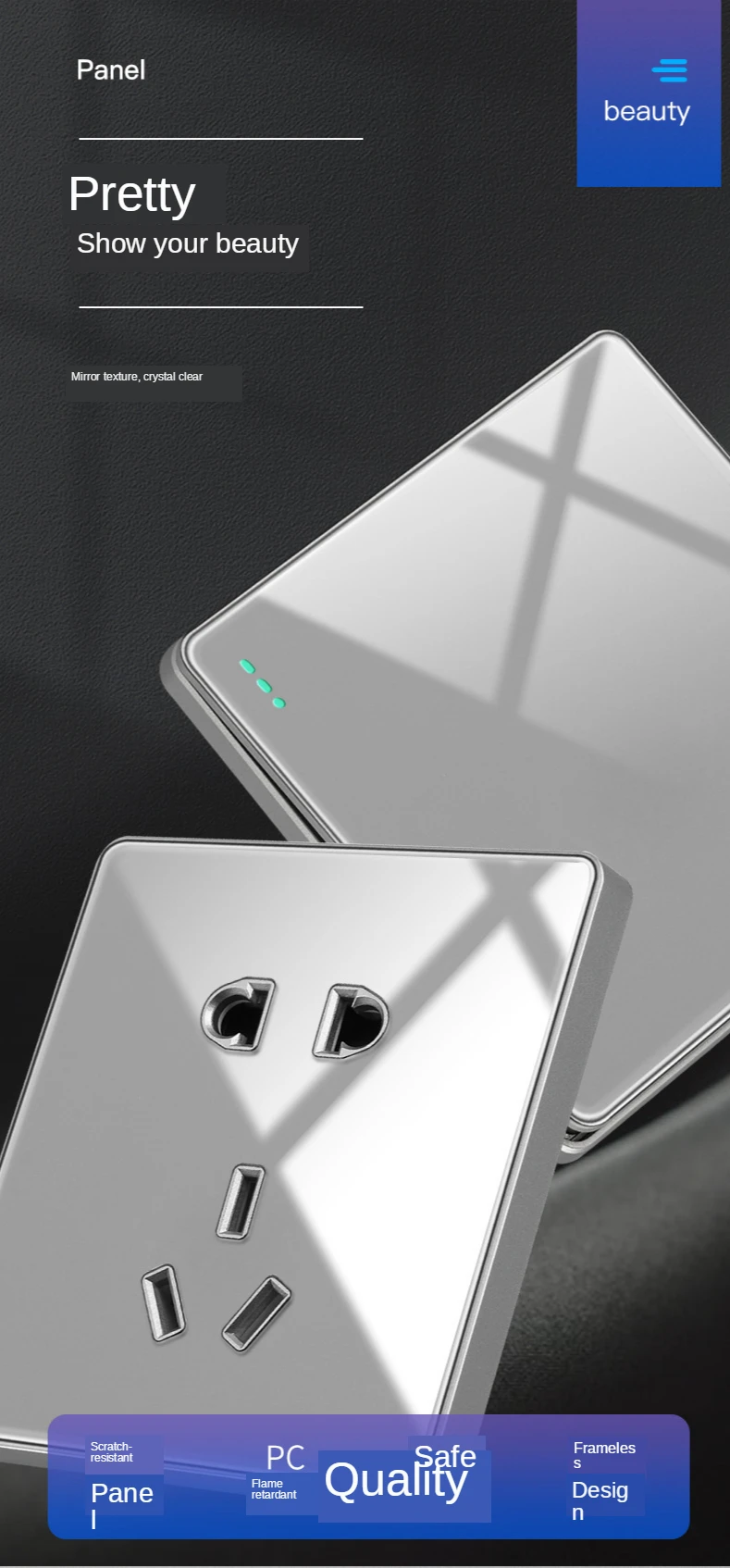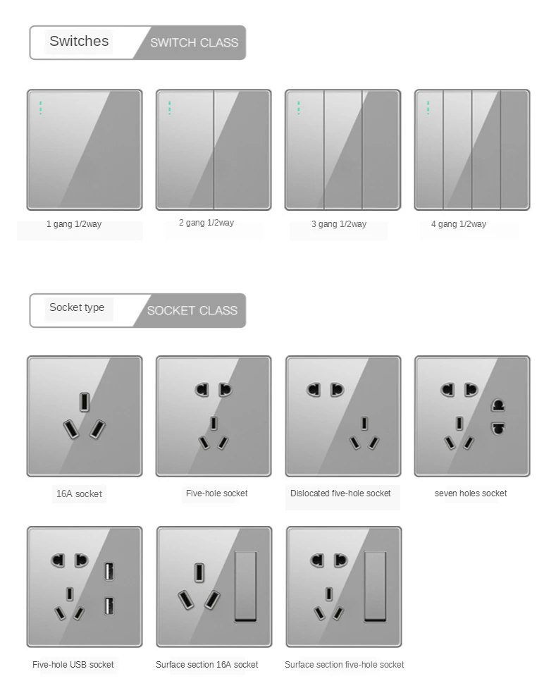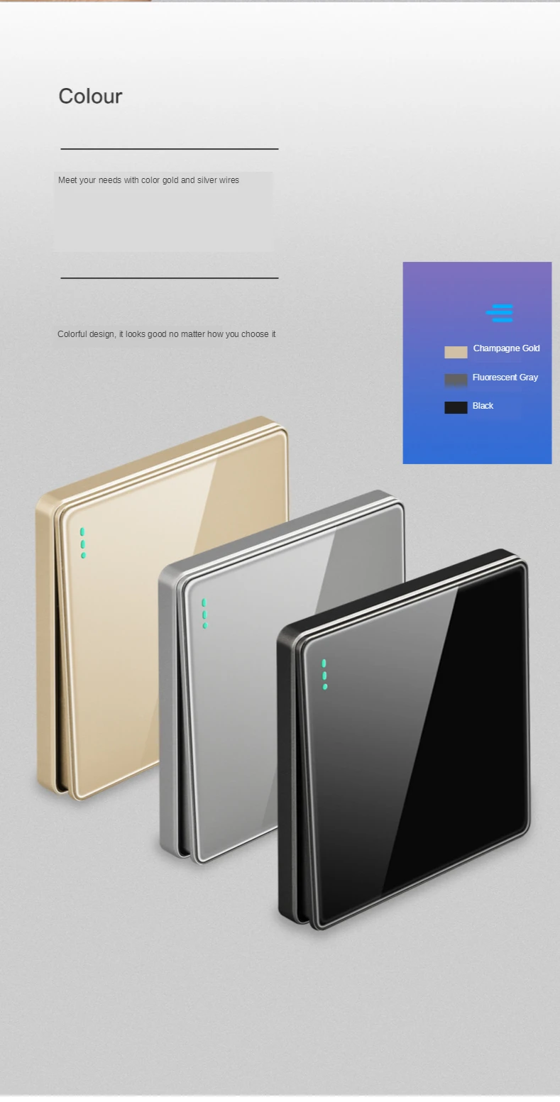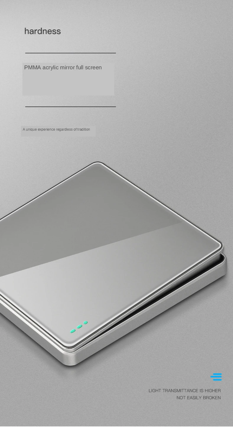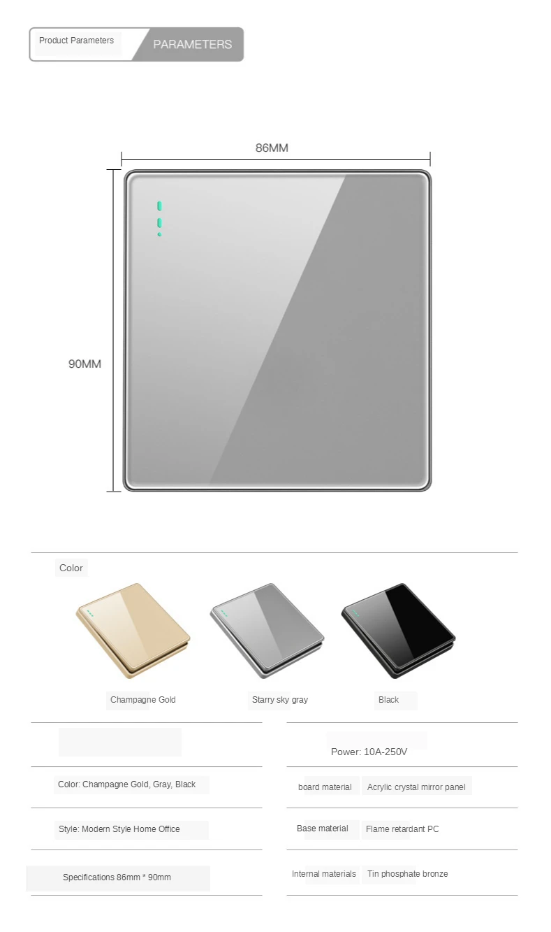 Название продукта: набор переключателей из серой акриловой панели 86 мм Номинальное напряжение: 250 В Номинальный ток: 10А Материал панели: ПК Цвет: серый Расстояние между монтажными отверстиями: 60 мм Размер продукта: 86*86 мм Сертификат: CCC Характеристики продукта: серия из серого акрила, модный внешний вид, серая акриловая панель, прочная устойчивость к царапинам