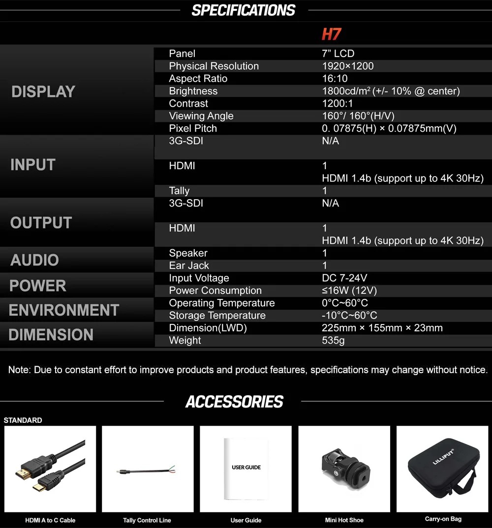 H7-это точный монитор камеры, предназначенный для съемки фильмов и видео на любом типе камеры.