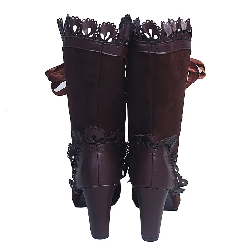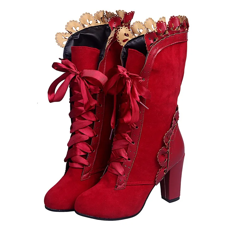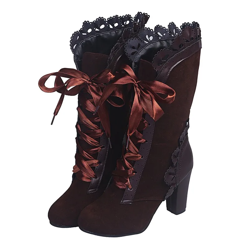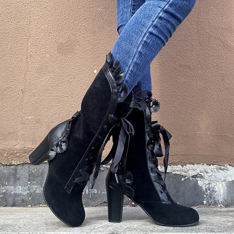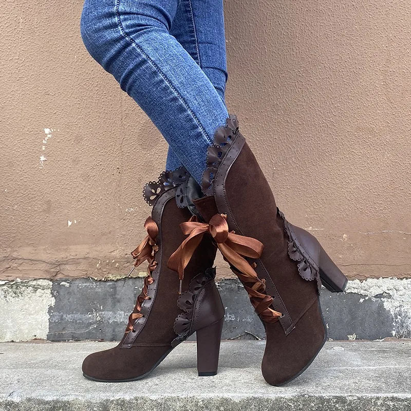 Женские ботинки в стиле ретро; Ботинки принцессы до середины икры; Зимняя обувь в стиле пэчворк на шнуровке; Ботинки на высоком каблуке; Обувь с круглым носком