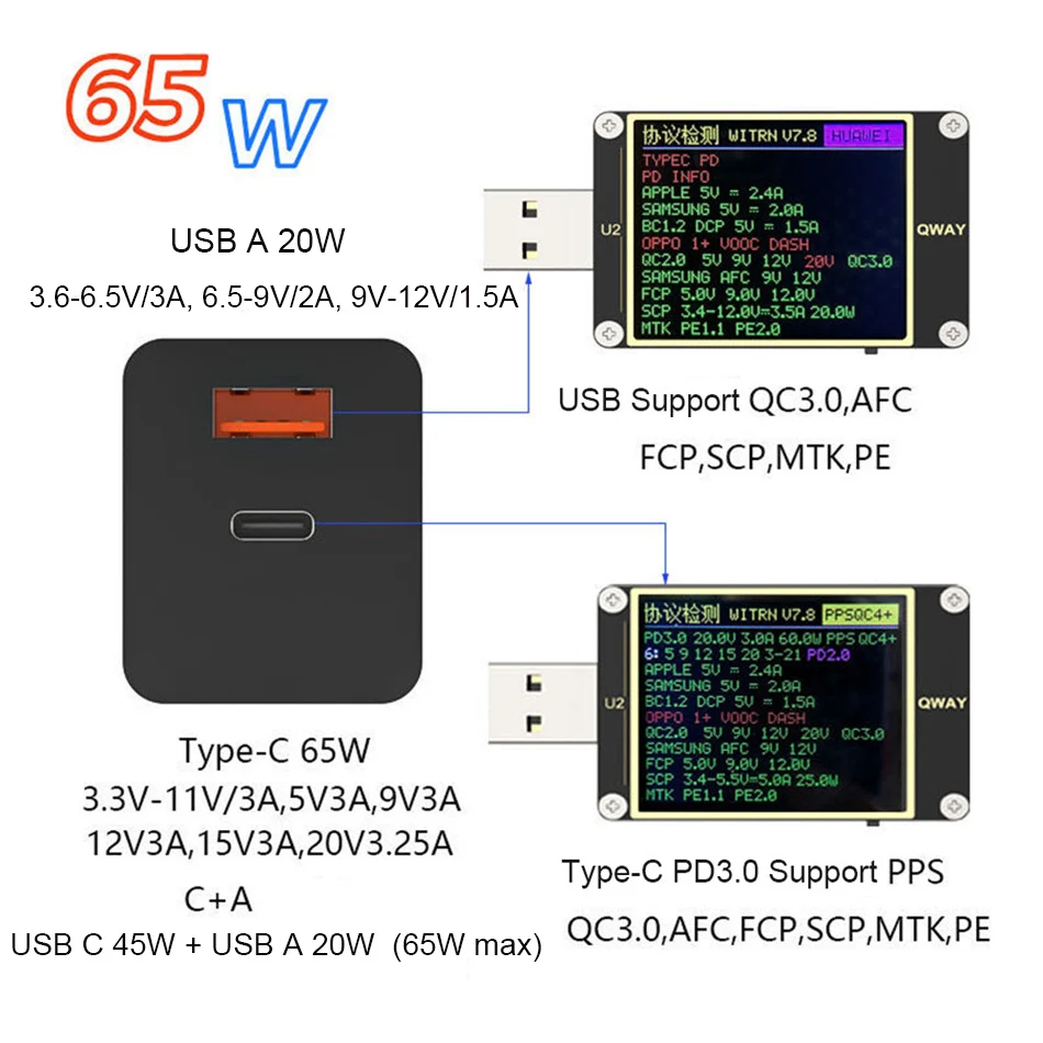 Поддержка быстрой зарядки PPS AFC FCP SCP MTK PE PD 3,0 QC 3,0 USB-C 65 Вт Выход: DC 3,3-11V/3A, 5V/3A, 9V/3A, 12V/3A, 15V/3A, 20V/3.25A (макс.: 65W) Выход USB A: 3,6-6,5 В/3 А постоянного тока, 6,5-9 В/2 А, 9-12 В/1,5 А (макс.: 20 Вт) 2 порта поддерживают 65 Вт (макс.) при одновременной зарядке USB-C + USB A Выход: C 45W + A 20W(65W)