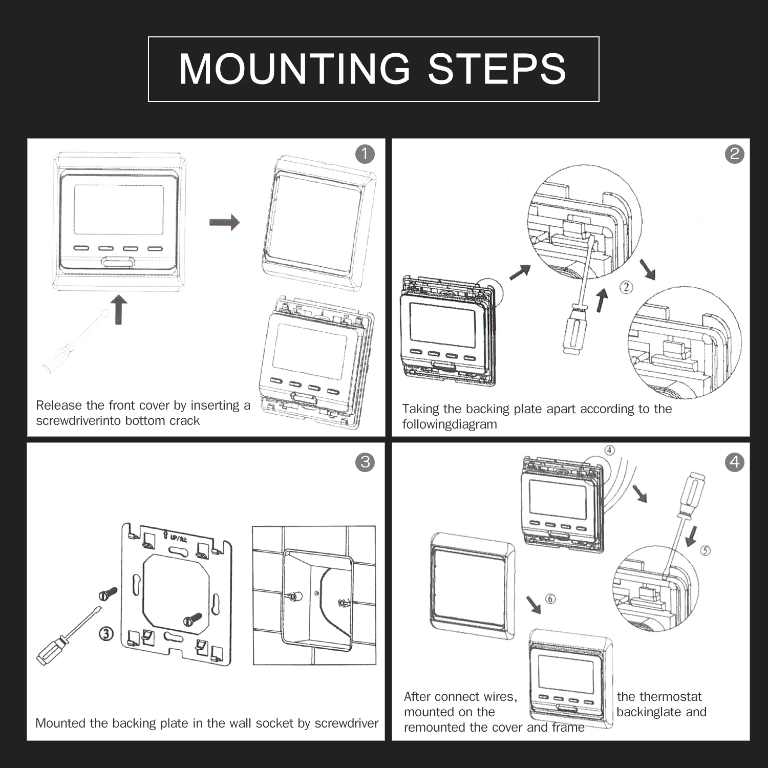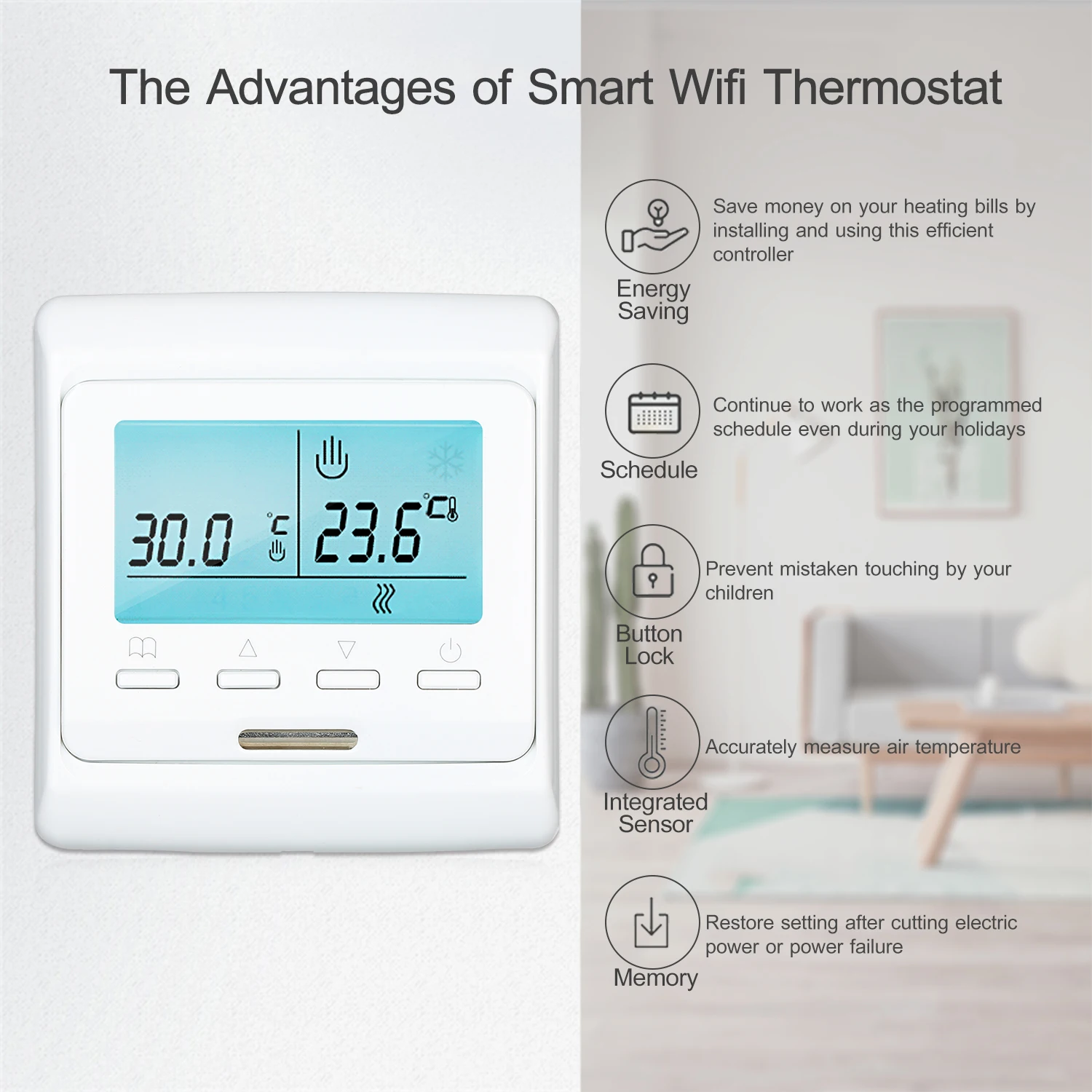 Еженедельный программируемый-поддерживает 5 + 2/6 + 1/7 дней различных температурных режимов в соответствии с 6 режимами ежедневной работы, высокоэффективный и энергосберегающий термостат, чтобы помочь снизить затраты на домашнюю энергию.