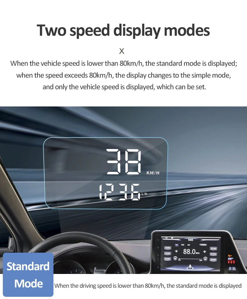 Когда скорость транспортного средства ниже 80 км/ч, отображается стандартный режим; Когда скорость превышает 80 км/ч, дисплей изменяется в простой режим, и отображается только скорость транспортного средства, который может быть установлен.