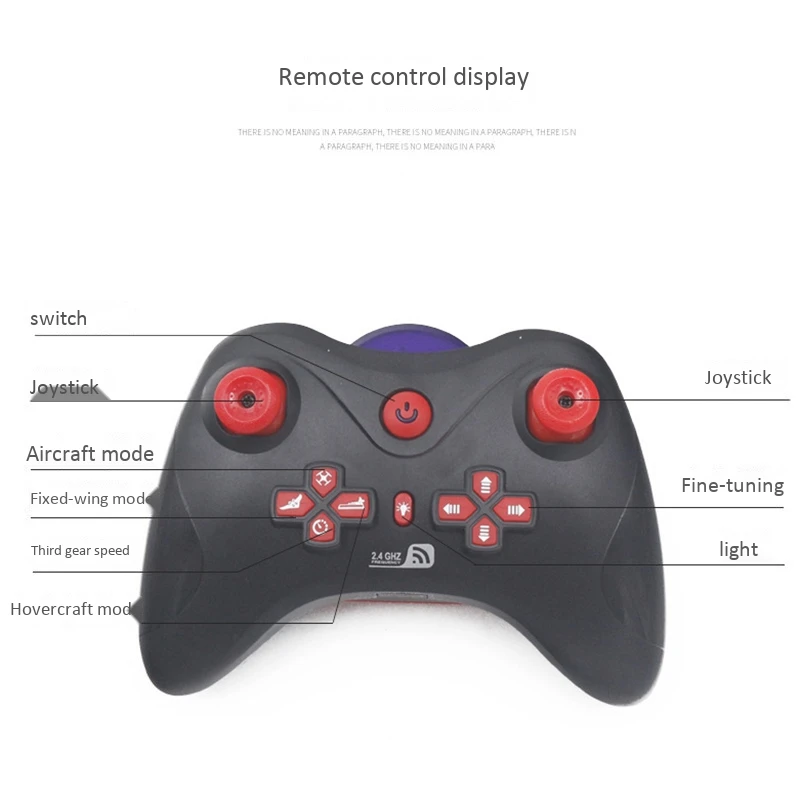 Функция: Режим квадрокоптера, режим планера, режим ховеркрафта, переход вперед/назад, поворот влево/вправо, 3D рулон, Безголовый режим, освещение, переключатель скорости.