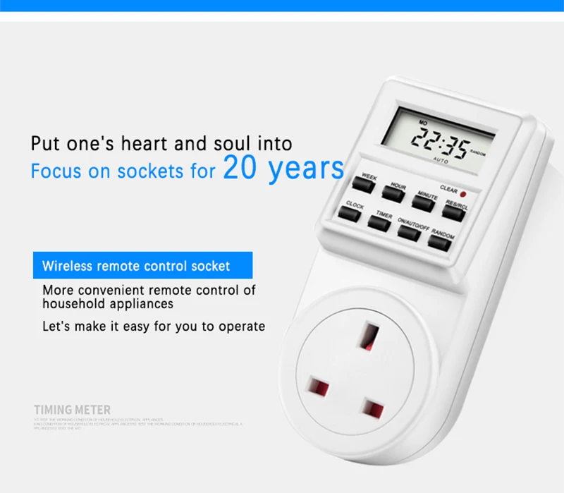 【Описание 】: Размер (прибл.):13 см x 5,8 см x 4,5 см/5,12 "x 2,28" x 1,77" Большой ЖК-дисплей Размер ЖК-дисплея (приблизительно):34*49 мм Тип штепсельной вилки: штепсельная вилка EU/FR/US/AU/UK/BR120V/BR220V (покупатели из России, пожалуйста, выберите штепсельную вилку EU) 【Напряжение/Тип: ЕС: 230V ~ 50Hz / 16A / 3680W FR:230V ~ 50Hz / 16A / 3680W США: 120 В ~ 60 Гц/15A / 1800 Вт AU:220V-240V 50Hz / 10A / 2400W Великобритания: 230V ~ 50Hz / 13A / 2900W BR120V:120V ~ 60Hz / 15A /1600W BR220V:220V-250V 50Hz / 16A /2500W Установка: плагин Время установки: 1 минута Рабочая температура:-10 ~ + 40 дегк Точность: 1 минута Батарея: никель-металл-гидридного 1,2 V (Батарея построен, простая в использовании, не снимающиеся бретели) Срок службы> 100 часов Подключаемый дизайн; Простое программирование Функция таймера 8 клавиш 6 видов дней настройки группы Настройка времени включает в себя час, минуту и неделю Режим летнего и зимнего времени Случайные функции 12/24 часов сменный Интегрированные аккумуляторные батареи Сертификация UL 【Набор синхронизации 】: Нажмите кнопку «Неделя», чтобы выбрать группу дней, которую вы хотите включить устройство. Есть 16 групп: MO TU WE TH FR SA sartu WE TH FRrarrSA SUrarrMO TU WE TH FR SArarrMO WE FRrarrTU TH SA rarrMO TU WErarrTH FR SArarrMO WE FR SU Нажмите кнопку «час» один раз из «0» ~ «23» или «1» ~ «12». Нажмите кнопку «minute» один раз от '00' ~ '59' Обязательно нажмите кнопку «reset/Recall» для сброса или отмены всех систем 【Комплектация: 1 x цифровая розетка таймера (пожалуйста, выберите тип, который вам нужен) 1 х руководство на английском языке [Примечание]: Возможны незначительные отклонения из-за ручного измерения. Из-за разницы между различными мониторами изображение может не отражать фактический цвет изделия. Если он не может отображаться при получении, Пожалуйста, подключите его к розетке в течение 10 минут, затем нажмите сброс, затем он может работать.