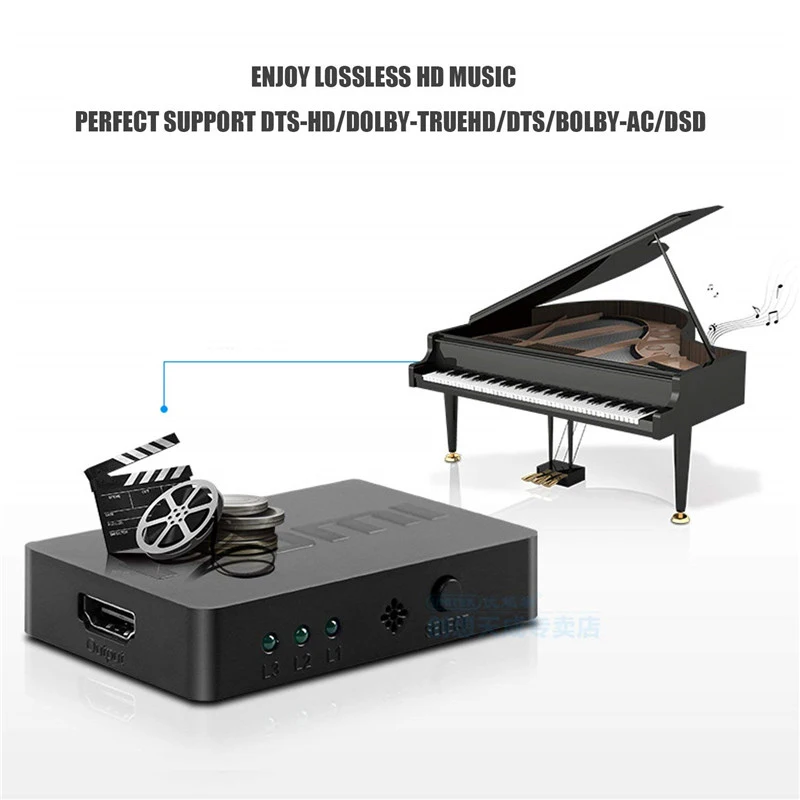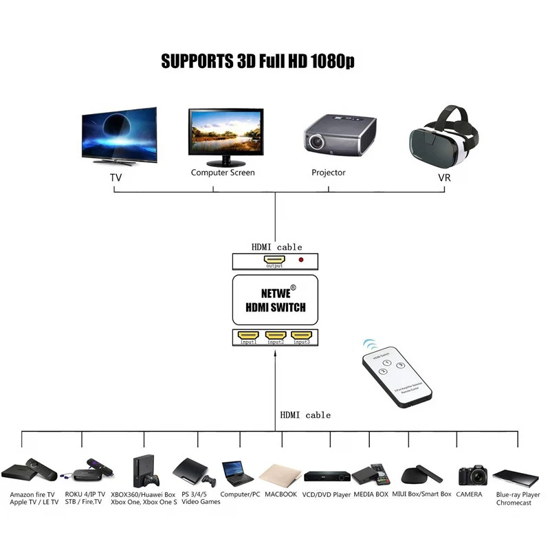 1. Коммутатор HDMI 3x1 позволяет переключать 3 порта HDMI на один дисплей с помощью пульта дистанционного управления или кнопки включения