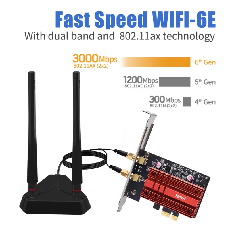 Модель: FV-AX210 Настольный wifi 6E адаптер (см. Подробности) Chipest: Intel AX210 Chipest Стандарт IEEE: 802.11ac/ax С Blutetooth 5,2 Двухдиапазонный 2,4 ГГц-300 Мбит/с/5Ghz-2400Mbps Поддержка MU-MIMO Примечание: скорость до 2400 Мбит/с (маршрутизатор должен поддерживать 802.11ax) Операционные системы: поддерживает только Windows 10*64 бит Совместимость с: почти компьютером с PCI Express (разъем PCI-E 1X/4X/16X) Загрузка драйвера: CD драйвер или с веб-сайта fenvi или веб-сайта Intel (Intel AX210).