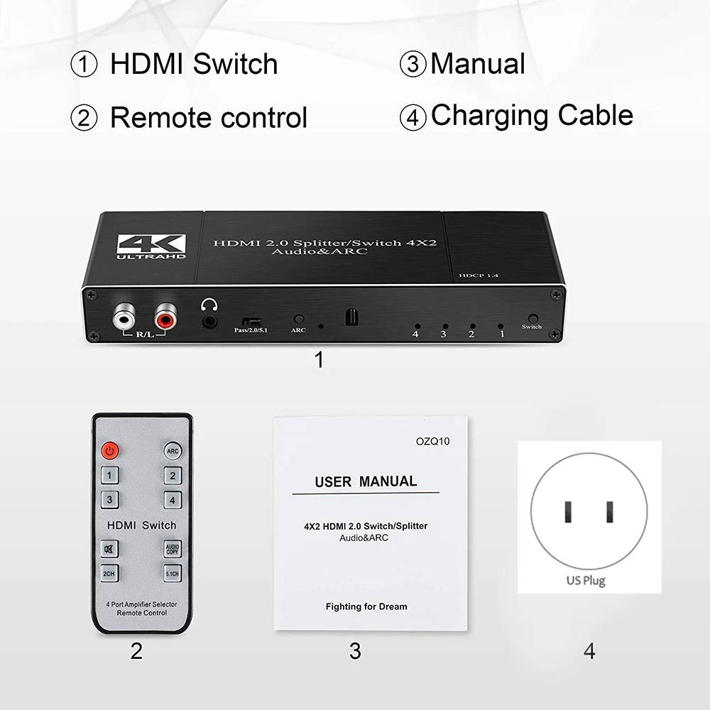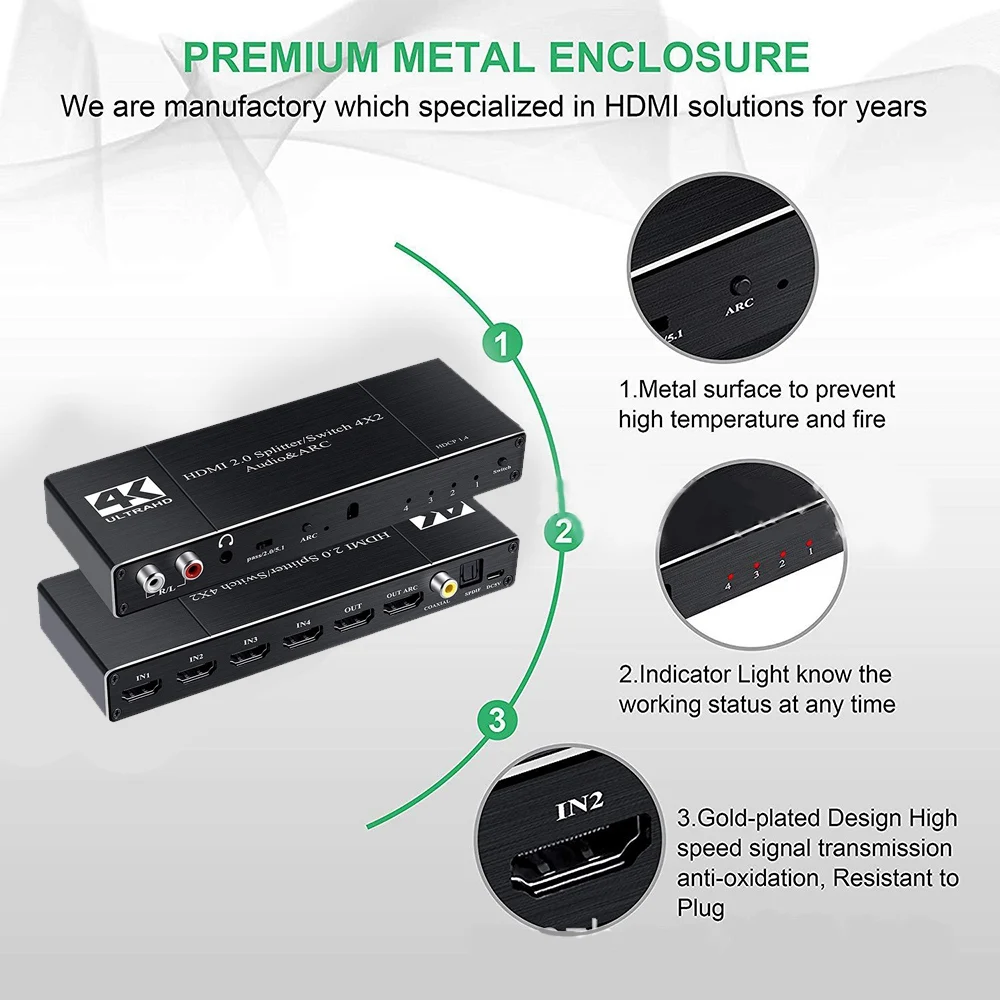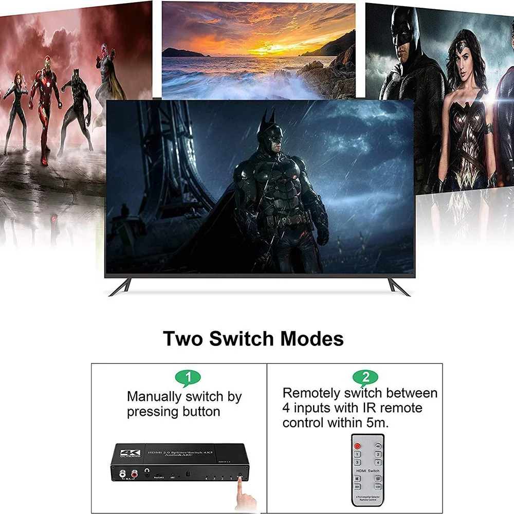 HDMI переключатель поддерживает 4 HDMI входа на 2 HDMI выхода, может быть применен для подключения, усиления сигнала, преобразования нескольких изображений и для выбора между компьютером/ПК, STB/Smart Box, DVD плеером, blue-ray Player, PS3/PS4 Pro и LCD TV,LCD,Projetor, а также o/Video ресивер.