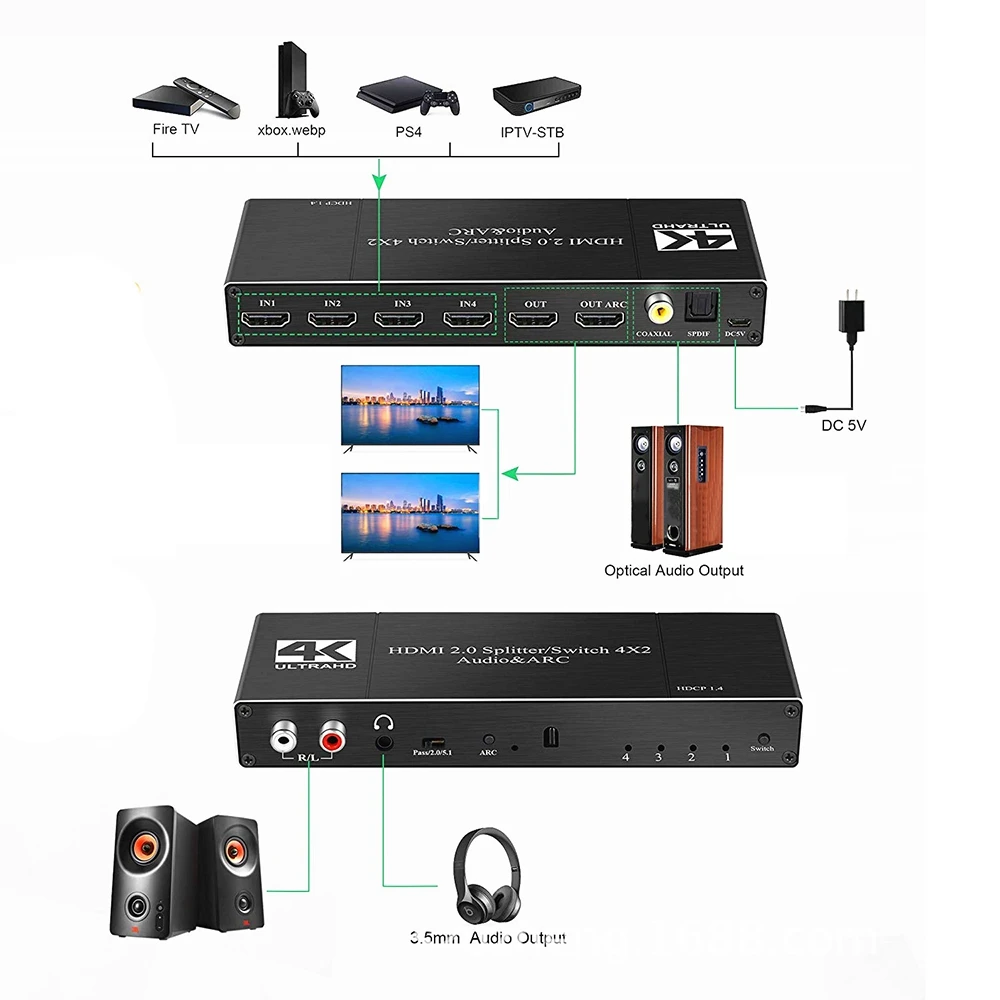 С оптическим Tolink SPDIF + L/R + 3,5 мм Jack + коаксиальный o out,Sup port s LPCM/Dolby/DTS 5,1 channel. Подключите порт HDMI(ARC) к этому выходному порту HDMI с помощью кабеля HDMI, затем с помощью оптического/коаксиального/R/L кабеля или 3,5 мм наушников к звуковой панели, динамику, домашний кинотеатр, приемники A/V и т. Д. Нет искажений o или видео.