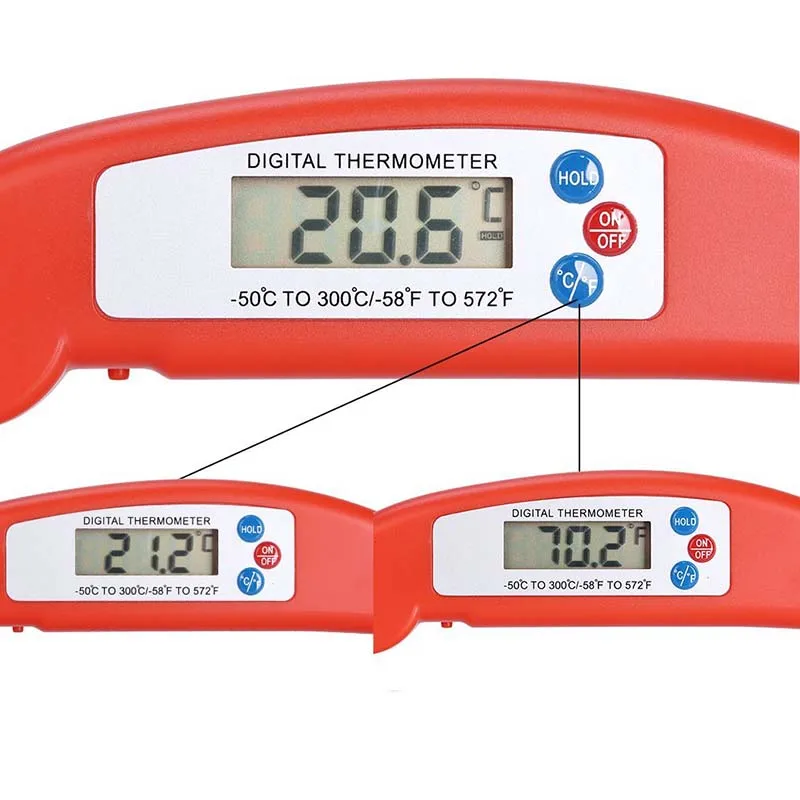 Он имеет функцию «замеров замораживания», если вы должны отображать температуру в течение длительного периода времени, чем термометр, и просто нажмите кнопку «удерживать».