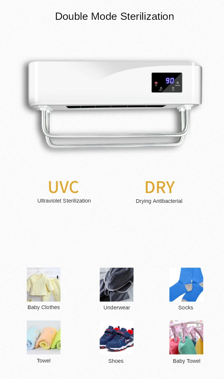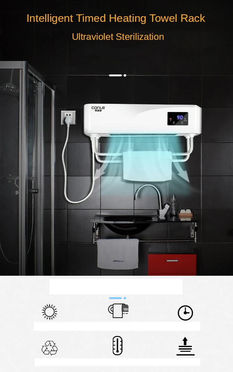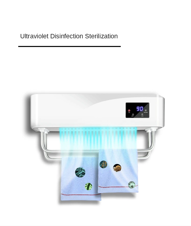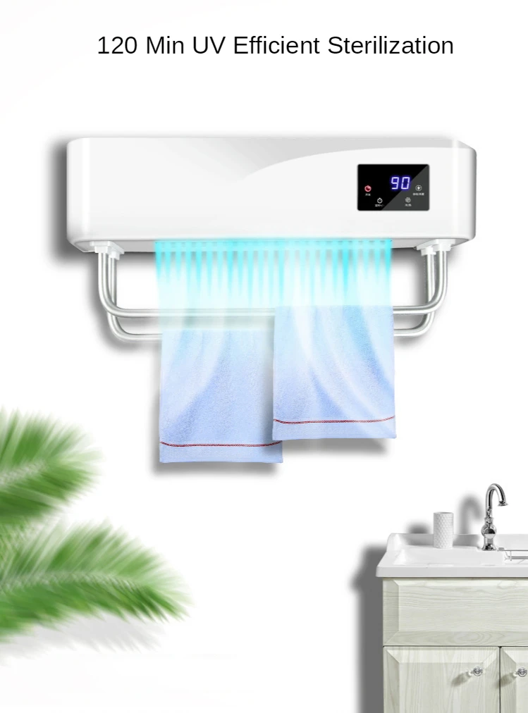 Название продукта: полотенце более теплый стеллаж Напряжение: 220 В Мощность: 700 Вт Материал корпуса: АБС-пластик с высокой термостойкостью Метод дезинфекции: ультрафиолет + время + горячий ветер Установка: штамповка на стене, не штамповка на стене. Размер: 468*235*119 мм