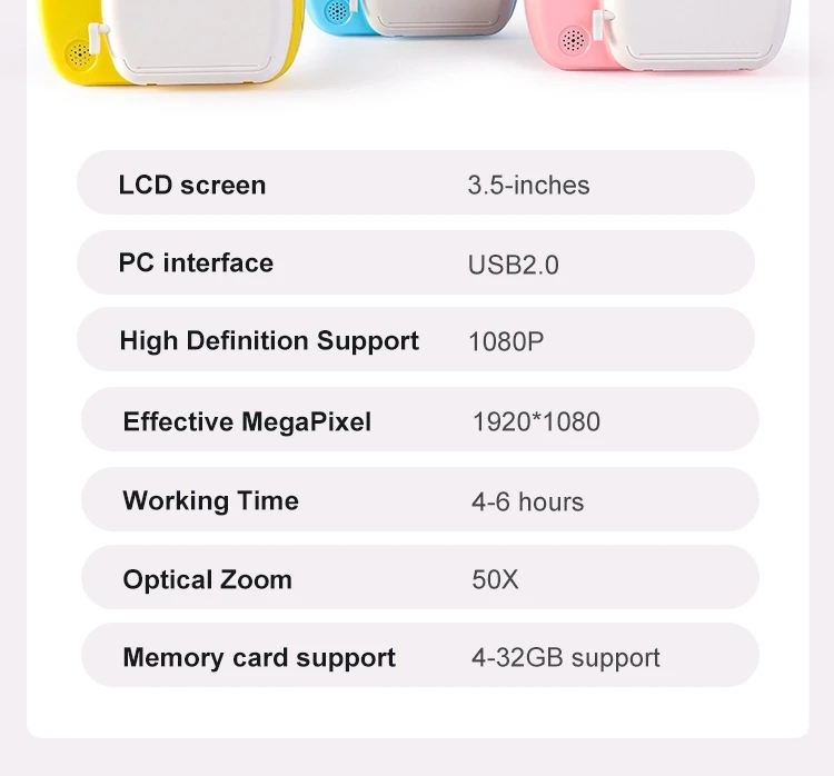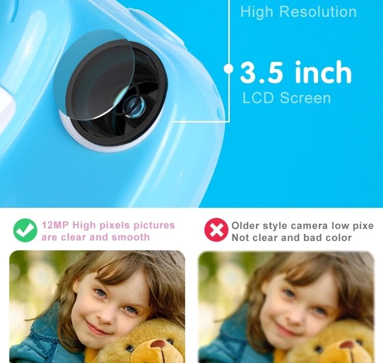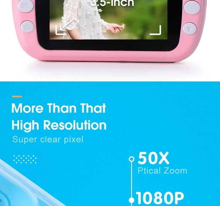 Новое Поступление Смарт 3,5 дюймов HD Дисплей Детский подарок цифровой видео Камера для детей 3,5 ''HD IPS LCD, резиновый материал Фронтальная камера: 30 м пикселей, 600Ah батарея с защитной панелью, защита кролика, программное обеспечение, Многоязычные, x50 Зумы Динамик: 1 Вт, ГБ, руководство пользователя, usb-кабель, ремешок, без sd-карты Время зарядки: 3-4 часа Тип: Другие Развивающие игрушки Изображения Сенсор: КМОП-матрица Угол линз 120 градусов Эффективных мегапикселей: 1920*1080 Поддержка высокой четкости: 1080p Медиа-Тип: хит продаж цифровые мини-видеокамеры Оптический зум: 50x Время работы: 5-6 часов Память: TF карта (не входит в комплект) Ток и напряжение: 5 В/1 А ЖК-дисплей экран: 3,5 дюйм (ов) Интерфейс ПК: USB 2,0 Память корпуса: TF карта (TF карта не входит в комплект) Видео: AVI Поддержка карт памяти: Поддержка 4-32 Гб Посылка включает в себя: камеру * 1, Силиконовый протектор * 1 Упаковочная коробка * 1 Руководство по эксплуатации * 1 Линия зарядного устройства * 1, ремешок * 1, Продукт Вес 80 г Вес/Подарочная коробка 170 г Размер/Подарочная коробка 113*113*54 мм