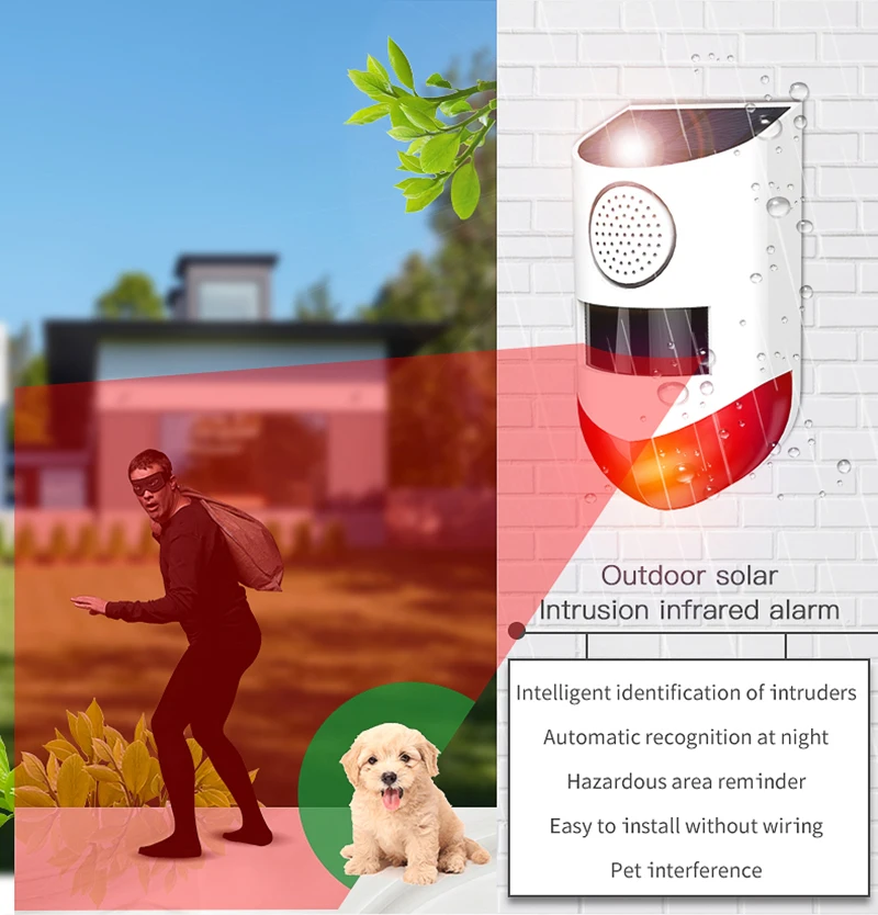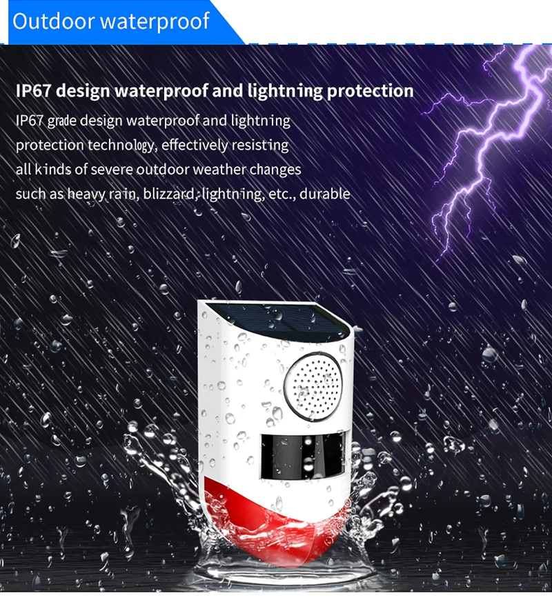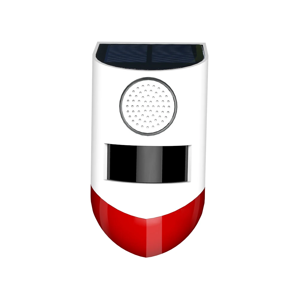 Светодиодный: 4 красных фонаря, видимый на 1000 метров Солнечная панель: поликремний 5 в 0,6 Вт Материал: АБС-пластик Метод зарядки: Солнечная Время зарядки: 6-8 часов Сигнал тревоги: 130 дБ (1000 метров) Уровень водонепроницаемости: IP65 Расстояние срабатывания: 9-12 метров (зависит от температуры окружающей среды) Угол индукции: угол индукции режима 110 градусов Параметры батареи: 3,7 В 600 мАч полимерная литиевая батарея Время работы: индукция 45 секунд или около того звук и светильник будильник более 500 раз, после зарядки, в режиме ожидания 60 дней
