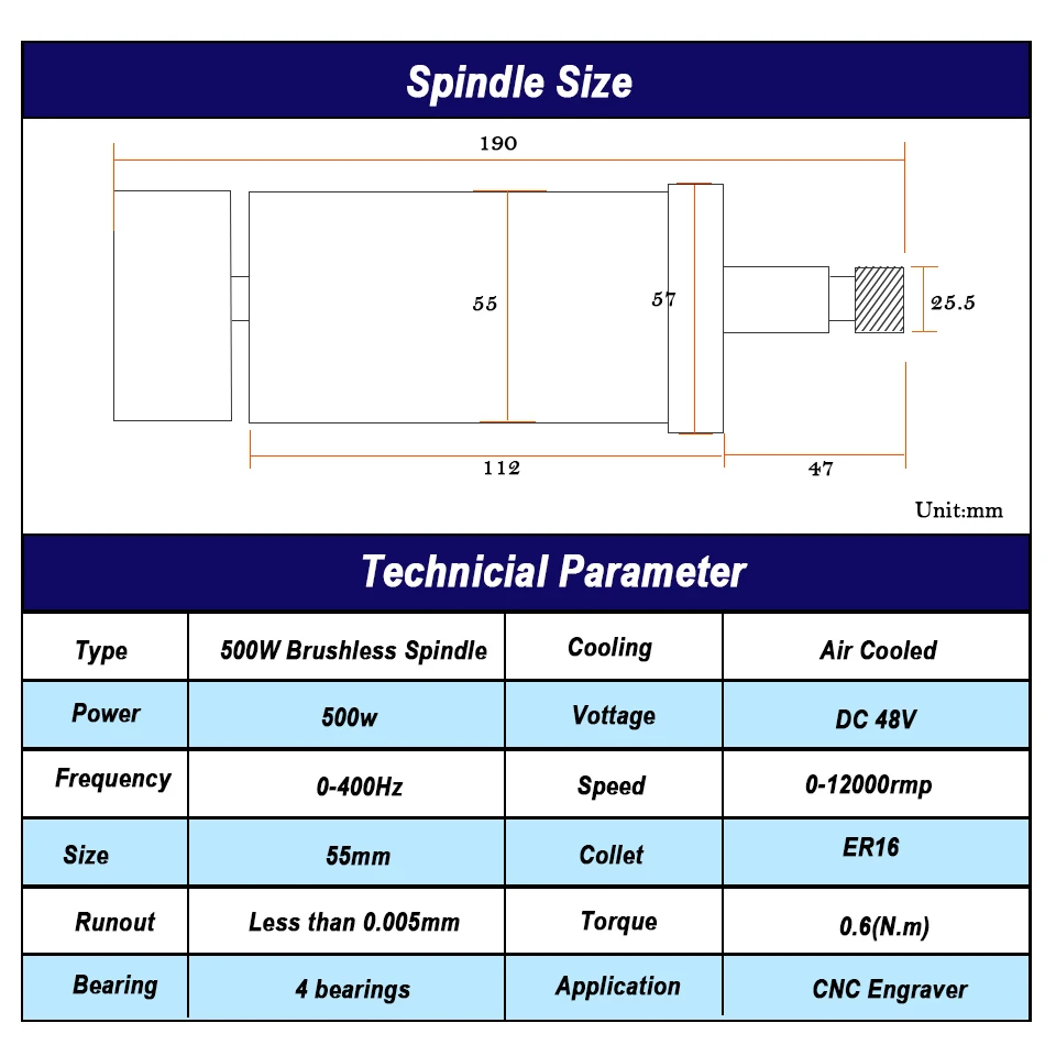 Мощность: 500 Вт Рабочее напряжение: 48 В постоянного тока Частота: 0-400 Гц Скорость: 0-12000 об/мин Охлаждение: воздушное охлаждение Цанга: ER16 Диаметр: 55 мм Максимальный крутящий момент: 0,55 нм Номер модели: Бесщеточный шпиндель постоянного тока 500 Вт Точность шпинделя: 0,01-0,03 мм Применение: резьба по дереву, сверление печатных плат