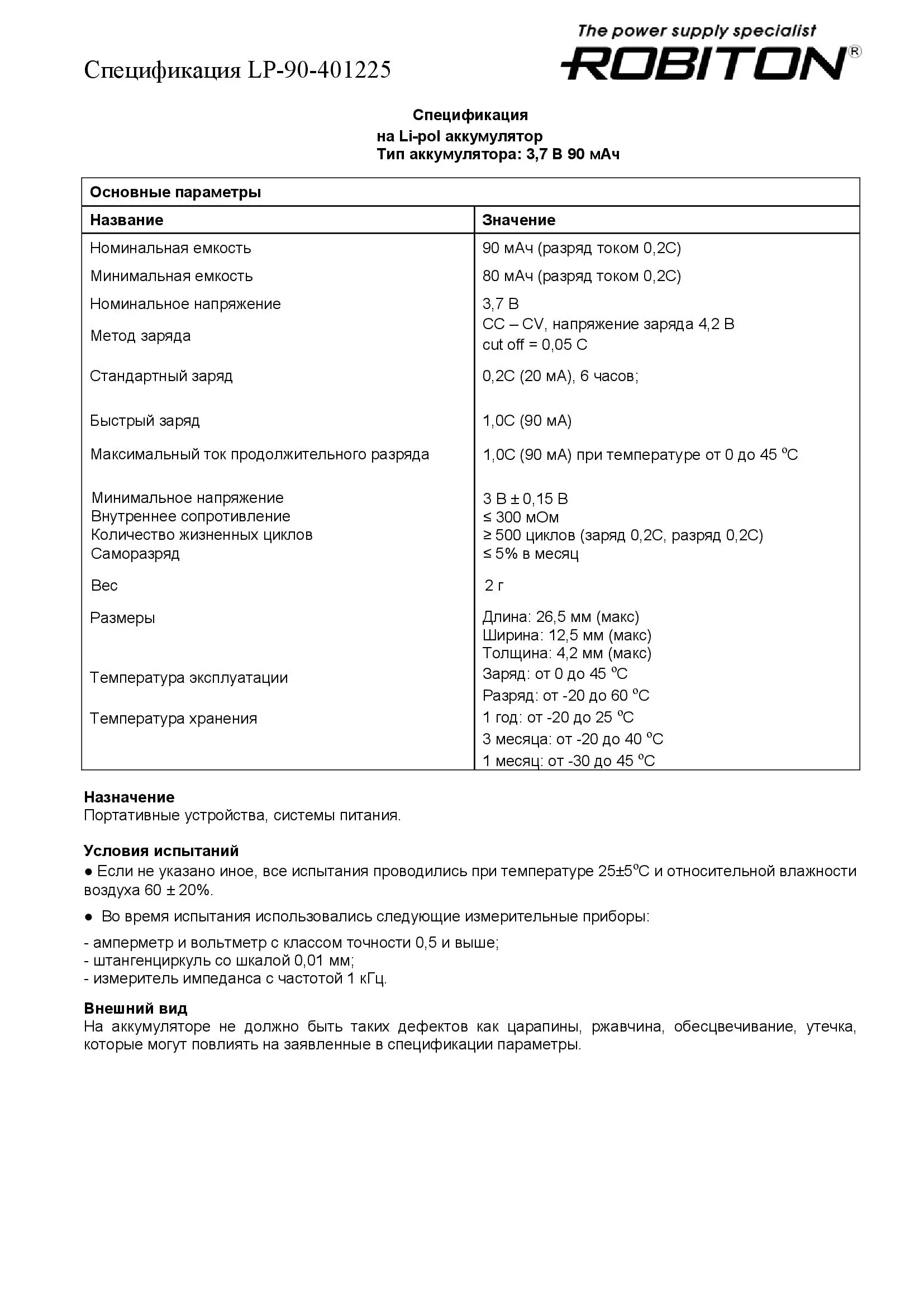 Спецификация:LP 401225 90мАч Пром.упаковка