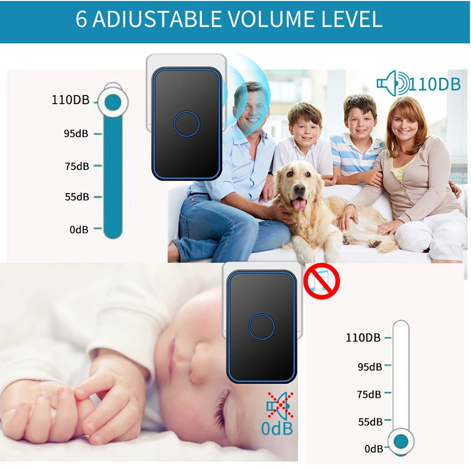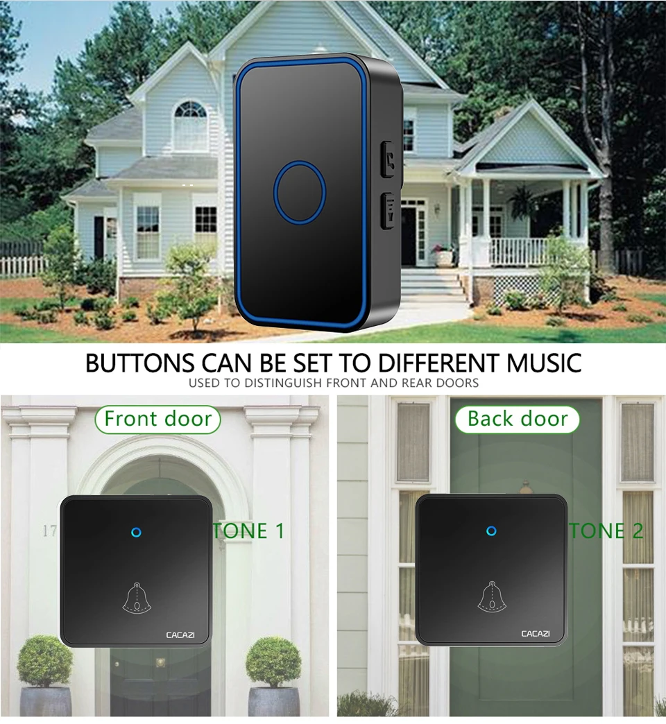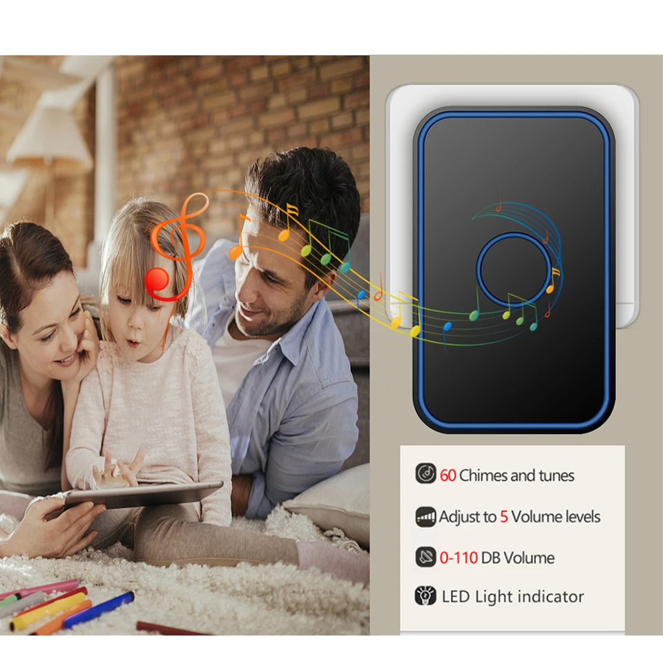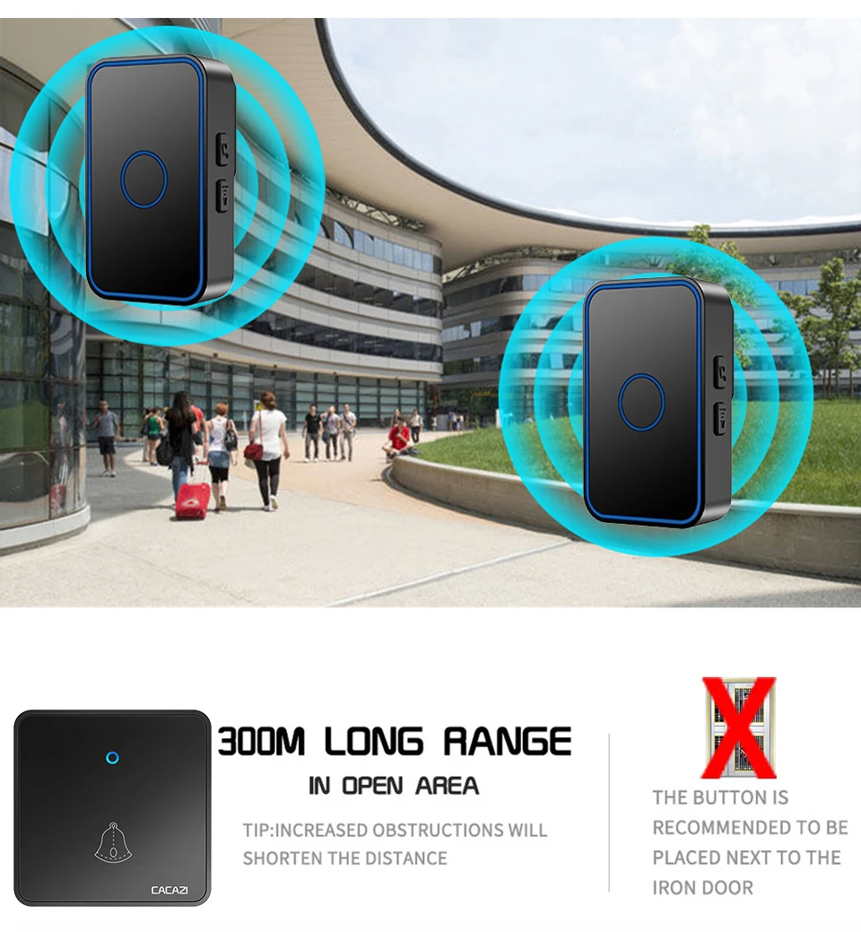 1. Кнопка поддерживает до 8 шт., а приемник поддерживает до 100 шт. 2. Если несколько кнопок соединены с одним или несколькими приемниками в одной системе, каждая кнопка может быть установлена на другой мелодии звонка. 3. Функция отключения памяти: Включите питание снова после выключения питания, не нужно повторно регулировать и блокировать мелодию звонка. 4. Передатчик не имеет винтового патрона, он может быть водонепроницаемым и пыленепроницаемым без резинового кольца. 5. Передатчик использует щелочную батарею CR2032 (аккумулятор в комплект не входит). 6. Напряжение приемника: 110-240 В. 7. Приемник доступен в различных вилках, штепсельных вилках США/ЕС/Великобритании и адаптерах Австралии, подходит для большинства стран. 8. Расстояние приема: 300 метров на открытой местности. 9. На беспроводной сигнал будут влиять препятствия. Чем больше препятствий, тем серьезнее потеря сигнала. 10. Приемник имеет 5 уровней (можно отключить звук) 0-110 дБ, 60 музыки на выбор. 11. Размер: передатчик 86x86x10 мм, приемник 84x52x29мм. Примечание: Кнопка не может быть размещена на железной двери, потому что это будет мешать сигналу.
