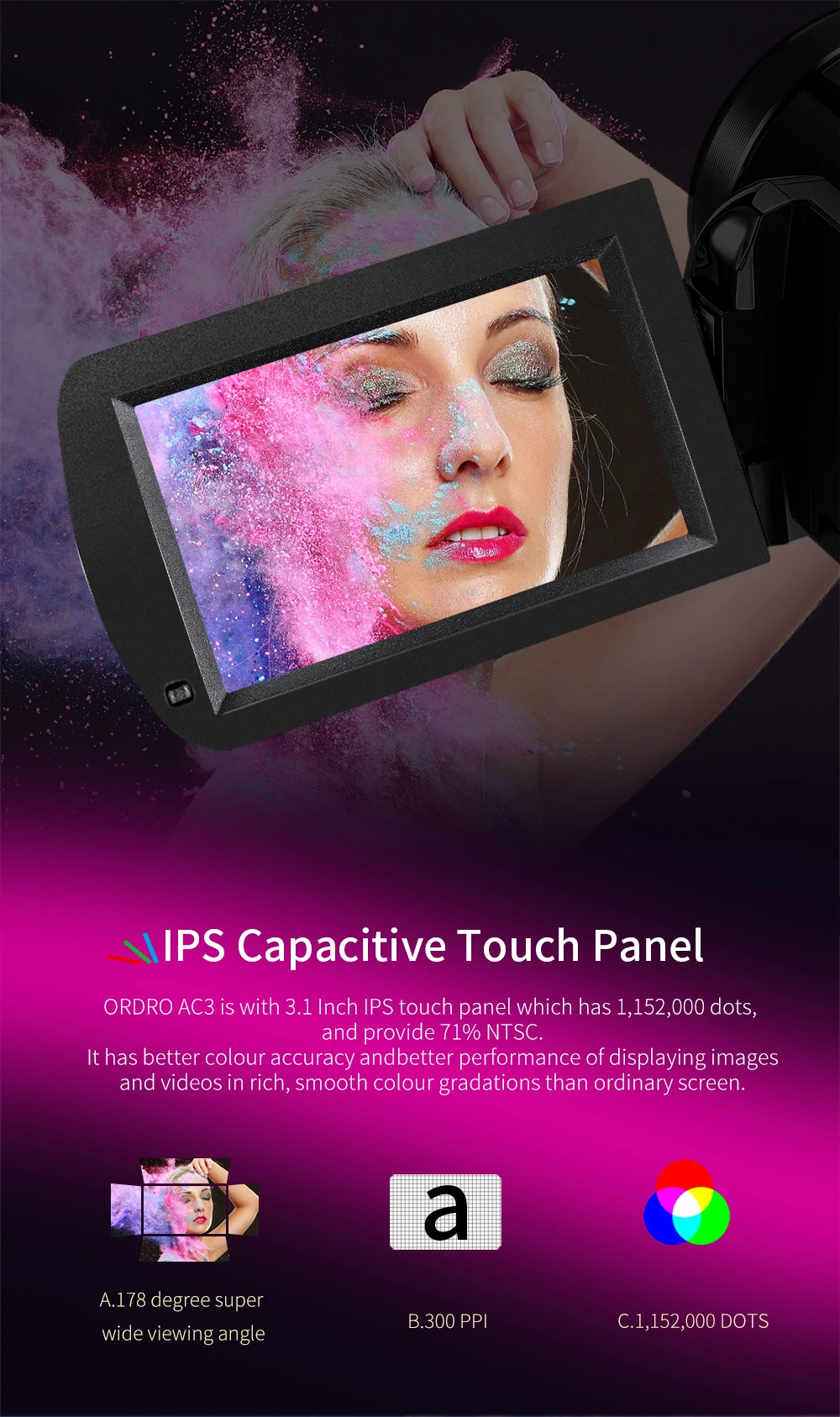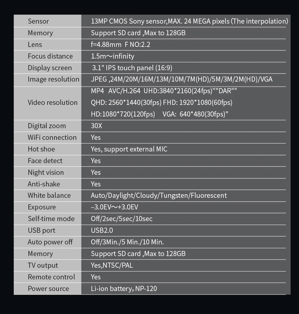 Сенсор: Датчик CMOS Sony IMX258 (максимальное количество пикселей составляет 24 м при интерполяции, и он использует технологию Exmor RS) Разрешение изображения: 24 м/20 м/16 м/13 м/10 м/7 м (HD) / 5 м/3 м/2 м (HD) / VGA Разрешение видео: UHD: 3840*2160 "DAR" (24 кадров в секунду), QHD: 2560*1440 (30 кадров в секунду), FHD: 1920*1080 (60 кадров в секунду), HD: 1080*720 (120 кадров в секунду), VGA: 640*480 (30 кадров в секунду) Внешняя память: поддерживает макс. 128 ГБ sd-карты (рекомендуется класс 10 или выше) Подходит для съемки расстояние: 1,5 метров до бесконечности Формат изображений: JPEG Формат видео: H.264 / MP4 ЖК-дисплей Экран: 3,1 "IPS ЖК-дисплей сенсорный экран Экран Объектив видеокамеры: f = 4,88 мм, FNo: 2,2 Выход HD: USB2.0 / HDMI 1,3 Автотаймер: 2s / 5s / 10s Светодиодный светильник: диапазон <1,0 м Воздействие: EV-3.0 ~ EV + 3,0 Чувствительность: Авто Анти-встряхивание: Да Пикантная обувь: Да Распознавание лиц: Да Зум: 30X цифровой зум (без оптического зума) Зарядный ток никель-металл: 800mA ТВ Выходная система: HDMI Автоматическое выключение: выключение/180 сек/300 сек/600 сек Промежуток времени: выкл/1 сек/3 сек/5 сек Срок службы батареи: Видеозапись ≤ 120 минут, фотосъемка ≤ 150 минут Батарея: NP-120 литий Батарея (3,7 V, 1700 мА · ч), оснащенного одной Батарея ИК-светильник: 1 х светодиодный ИК-фильтр с двойным фильтром, меняйте свою фотографию от цвета к черно-белому Пульт дистанционного управления: Да (при использовании пульта дистанционного управления удалите широкоугольный объектив, в противном случае отверстие ИК-сигнала будет покрыто линзой) Стандартный посылка прайс-лист 1 * AC3 Цифровая видеокамера 1 * NP-120 литиевая батарея 1 * пульт дистанционного управления 1 * Зарядное устройство 1 * USB кабель 1 * HDMI кабель 1 * крышка объектива 1 * Камера сумка 1 * Руководство пользователя (на английском языке) 1 * видеокамера коробка