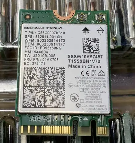 100% 100% оригинальная беспроводная карта Intel Номер модели: 3168NGW Версия для фотостудии: Generic Класс беспроводного устройства: 802.11a/b/g/n AC 433 Мбит/с + BlueTooth Интерфейс NGFF M.2 Товар обнаружен перед отправкой Пожалуйста, убедитесь, что слот устройства совпадает с этим модулем. Данный модуль подходит для большинства ноутбуков.
