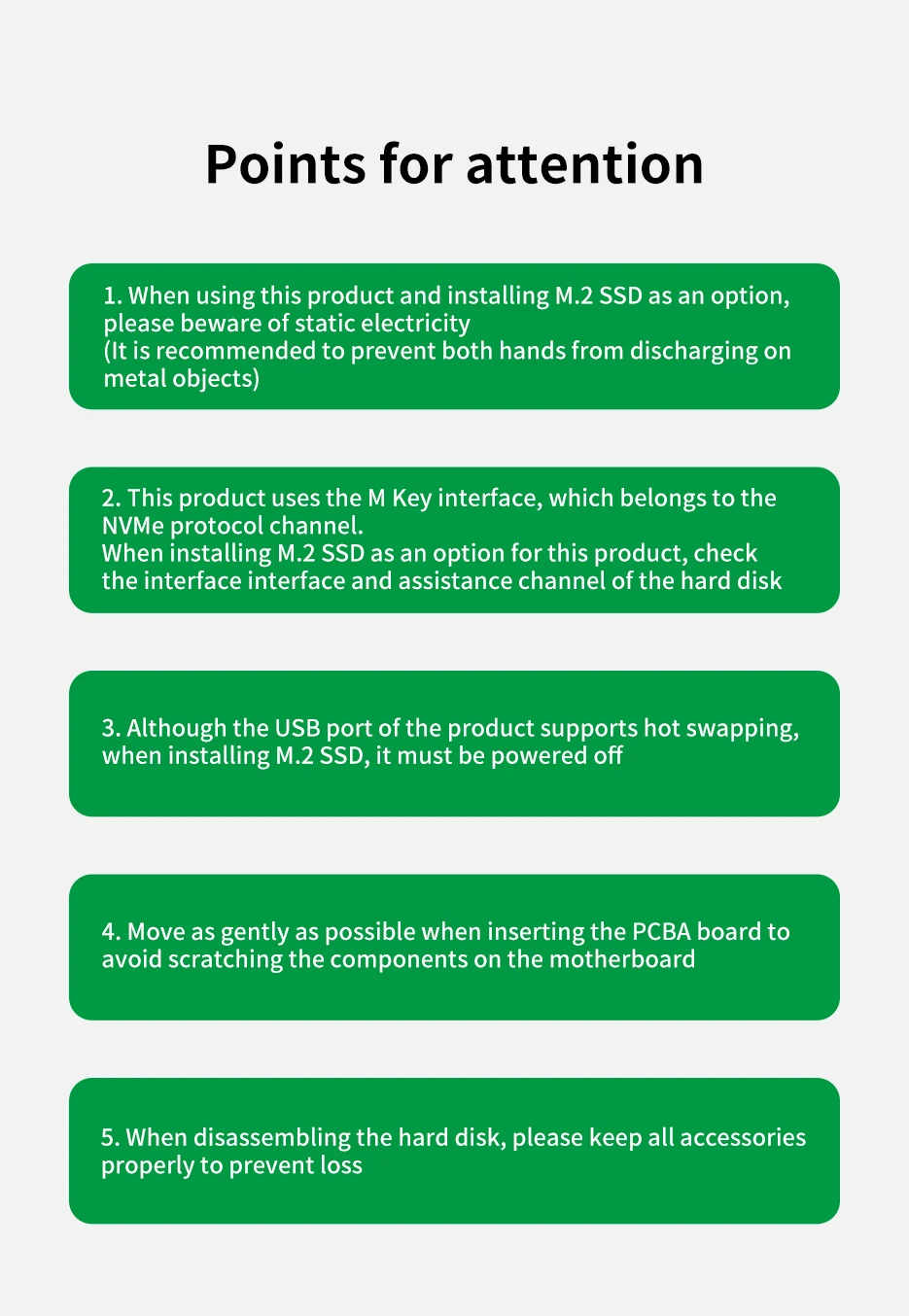 Теплое напоминание NVME PCI-E protoco поддерживает только M ключ/M + B Ключ SSD Протокол NGFF SATA поддерживает только ключ B/M + B Ключ SSD -M.2 SSD не входит в комплект. -NVMe-чехол модели не совместим с NGFF SATA M.2 SSD, наоборот. -Это нормально, что Алюминиевый Чехол нагревается при использовании, и это не влияет на нормальное использование. -Мы предлагаем использовать встроенный кабель для передачи данных для подключения ssd чехол для обеспечения скорости передачи, другая длина кабеля должна быть меньше 0,5 м. -Для новых неиспользуемых SSD необходимо сначала сделать раздел, в противном случае он не может быть распознан. -Всегда безопасно удаляйте диск перед отключением этого продукта.