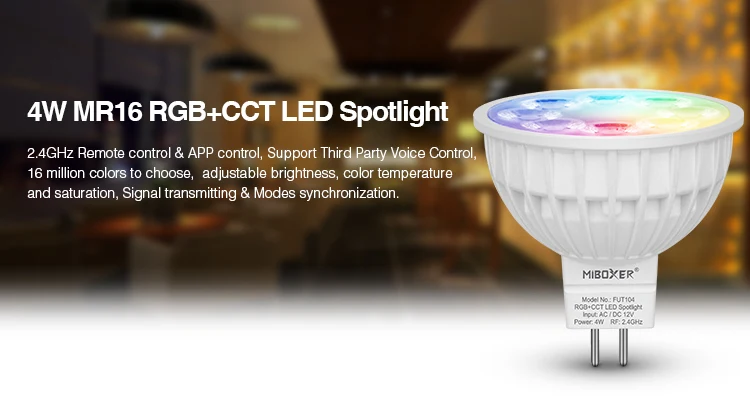 Название продукта:4 ВтGU10Светодиодный прожектор RGB + CCTНомер модели:FUT103Мощность: 4 ВтНапряжение:AC100 ~ 240 В50/60HzКельвин: 2700K-6500KСветовой поток: 250 лм ~ 280 лмСветоотдача: 70 лм/ВтCRI: >80Коэффициент мощности:> 0,55Срок службы: 50000 часовТип основания: GU10Угол луча: 25 °RF: 2,4 ГГцРасстояние управления: 30 м