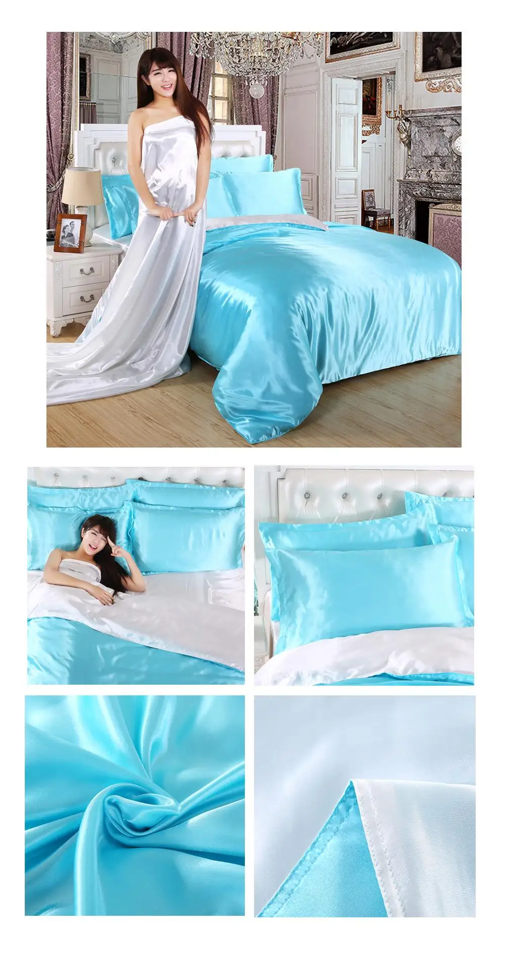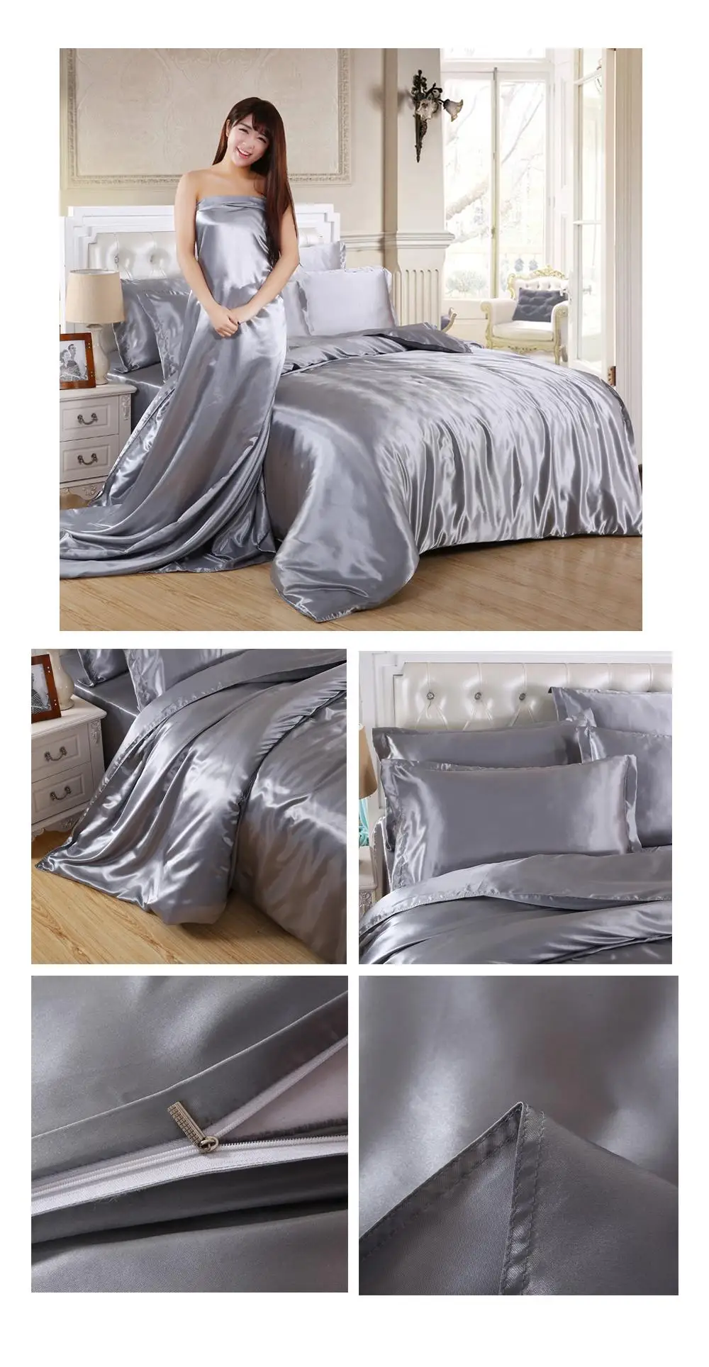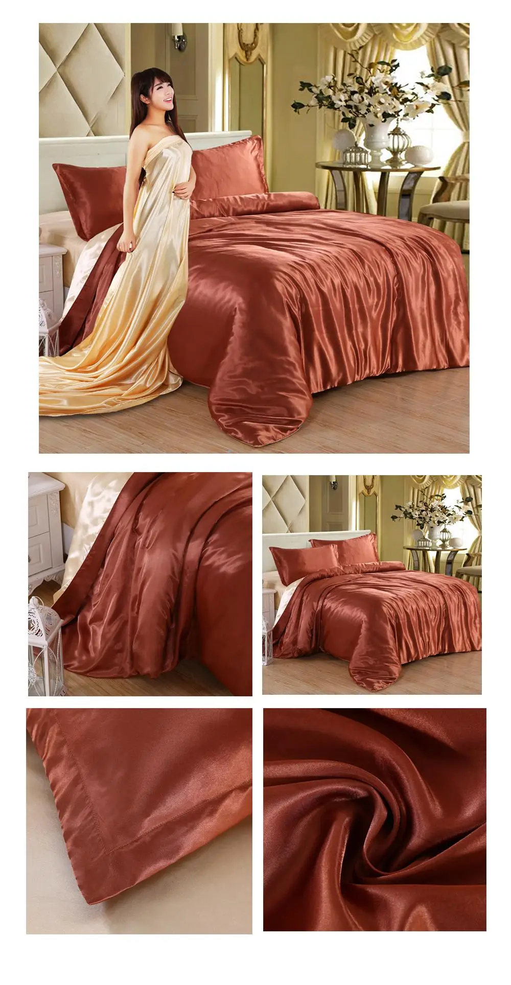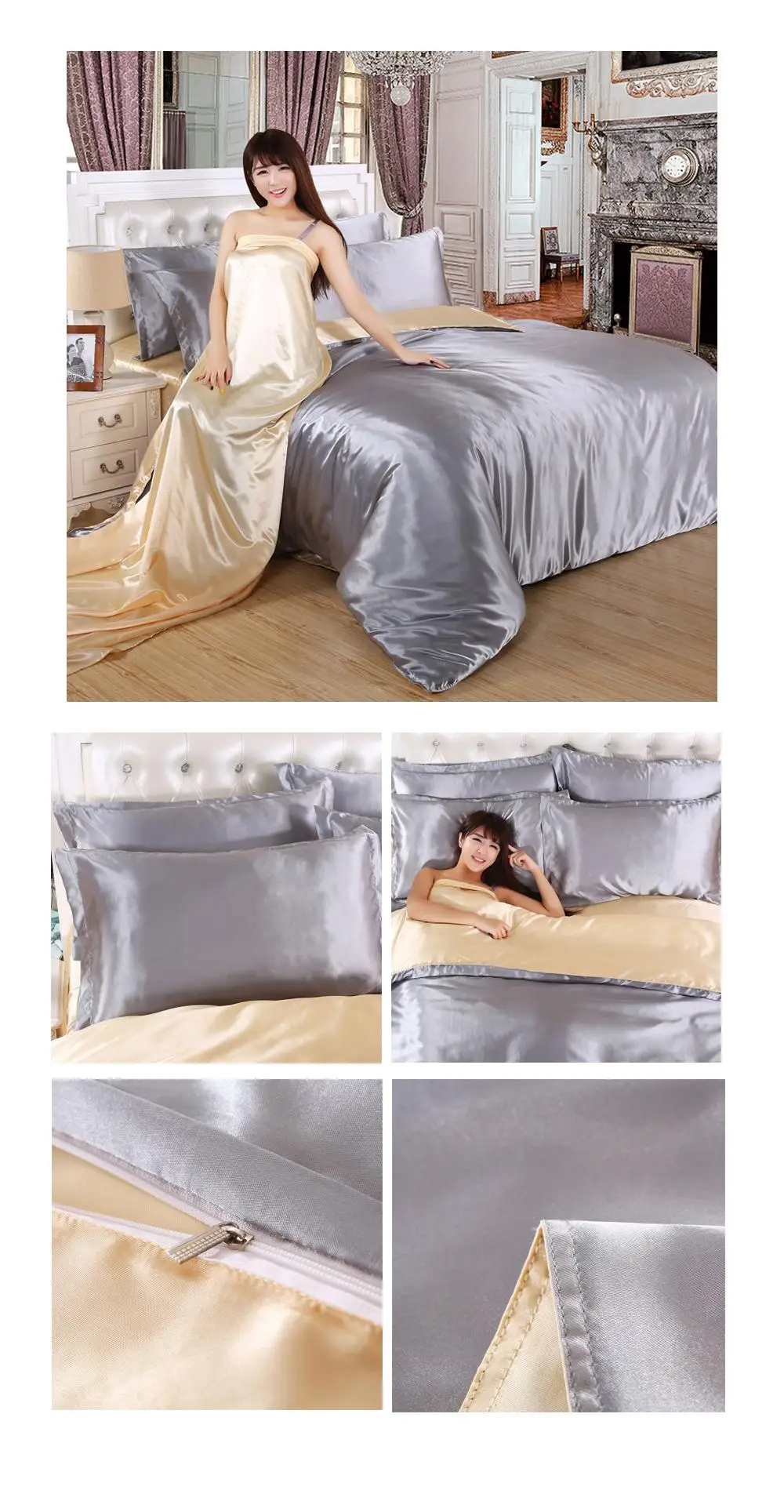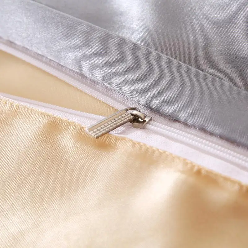 1.100% атласная шелковая ткань, устойчивая к морщинкам, позволяет покрыть одеяло шелковистым и гладким. Сделает вашу кровать более роскошной и удобной. Прохладно летом и тепло зимой делает его идеальным выбором для постельных принадлежностей из сезона в сезон.