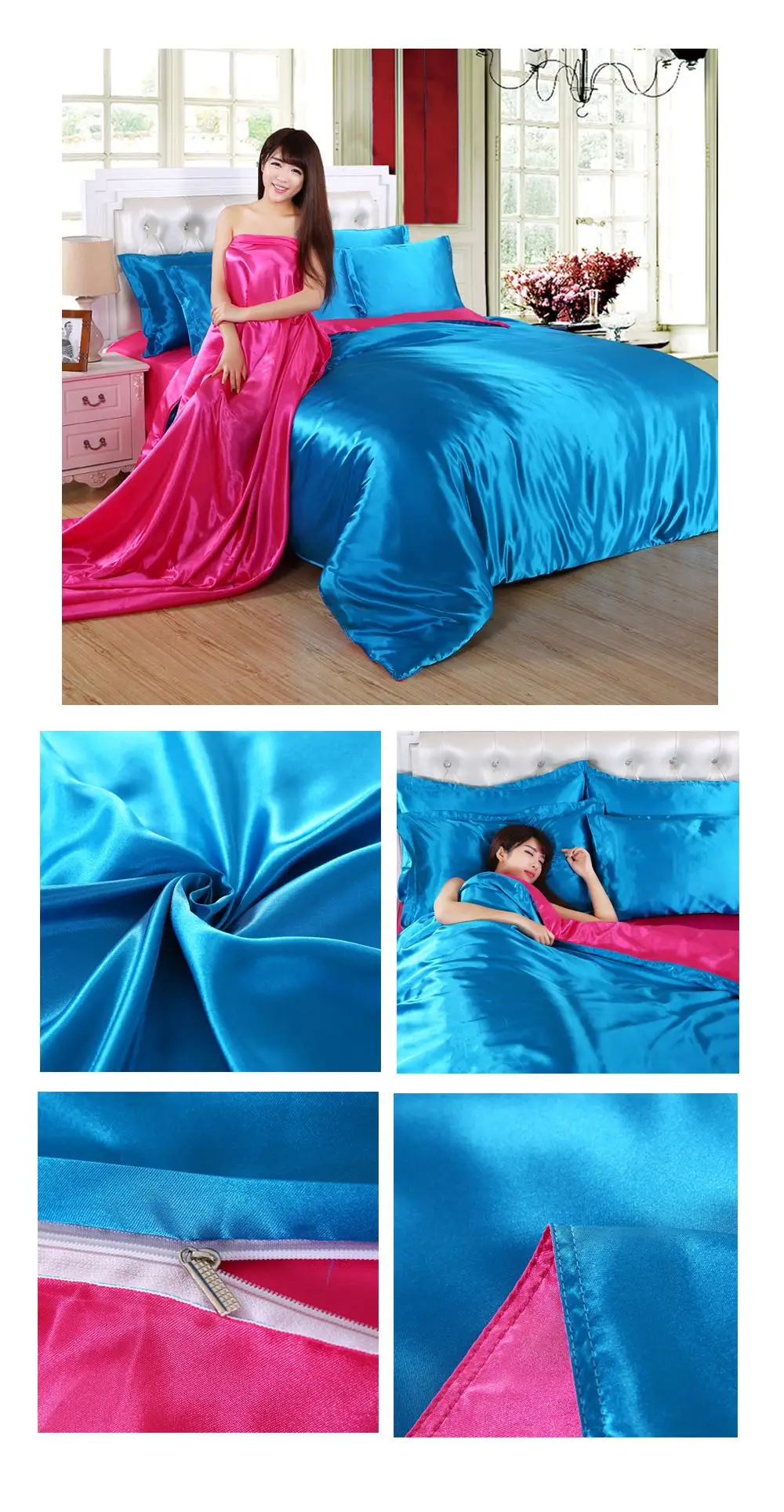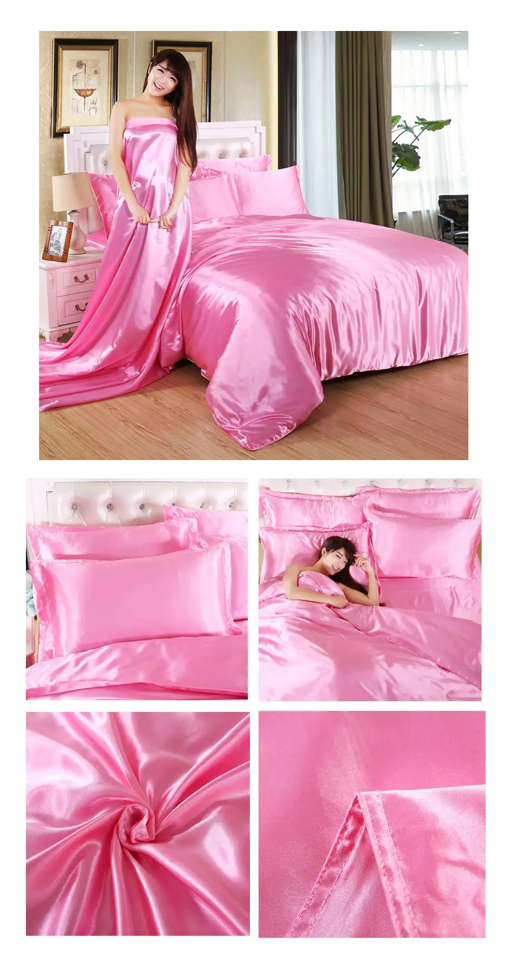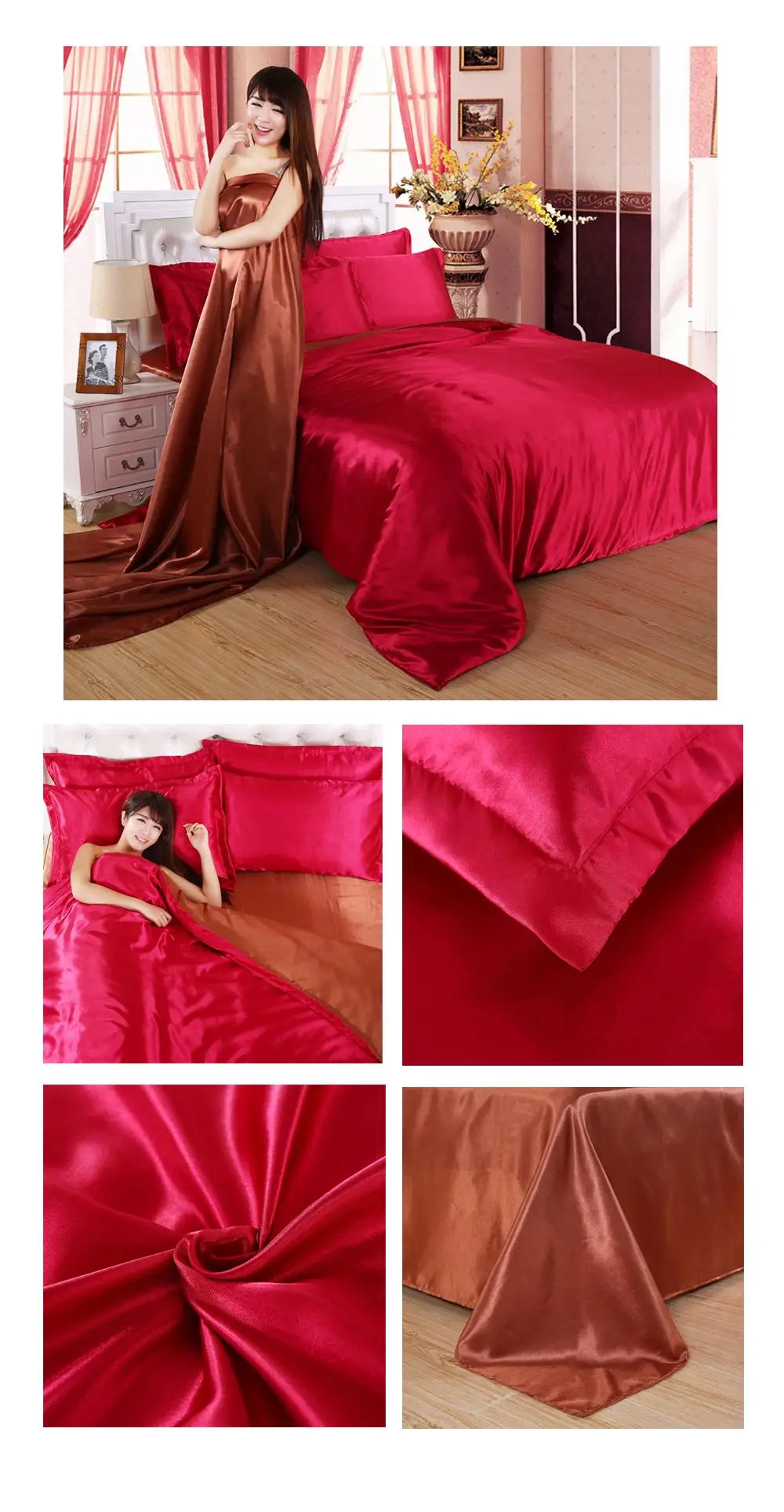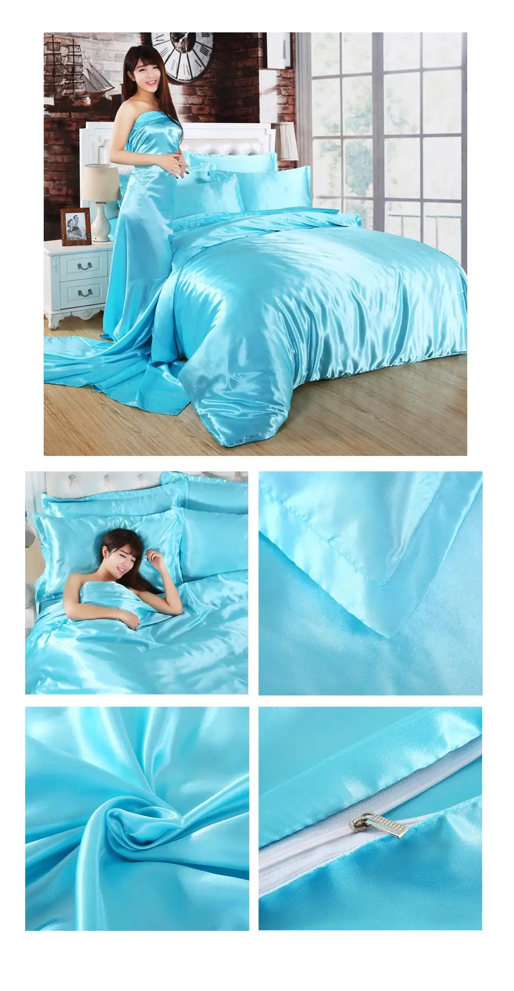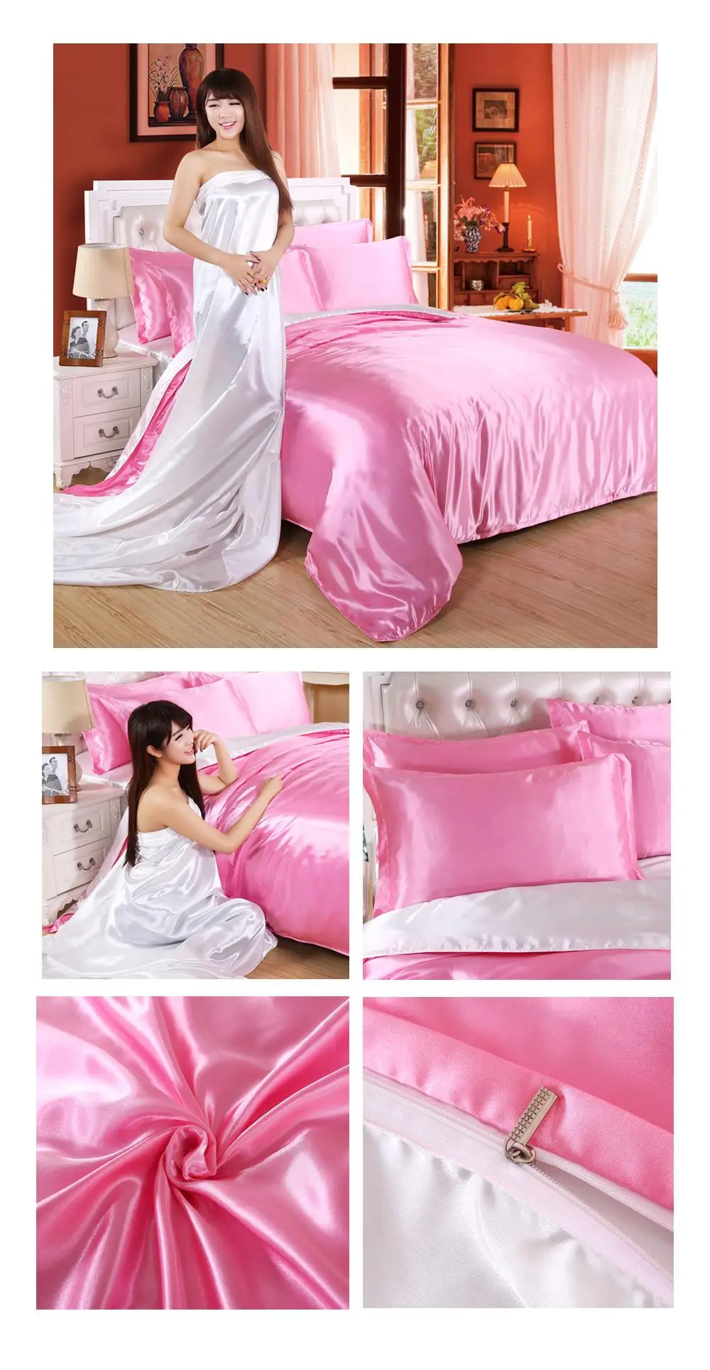 1.100% атласная шелковая ткань, устойчивая к морщинкам, позволяет покрыть одеяло шелковистым и гладким. Сделает вашу кровать более роскошной и удобной. Прохладно летом и тепло зимой делает его идеальным выбором для постельных принадлежностей из сезона в сезон.
