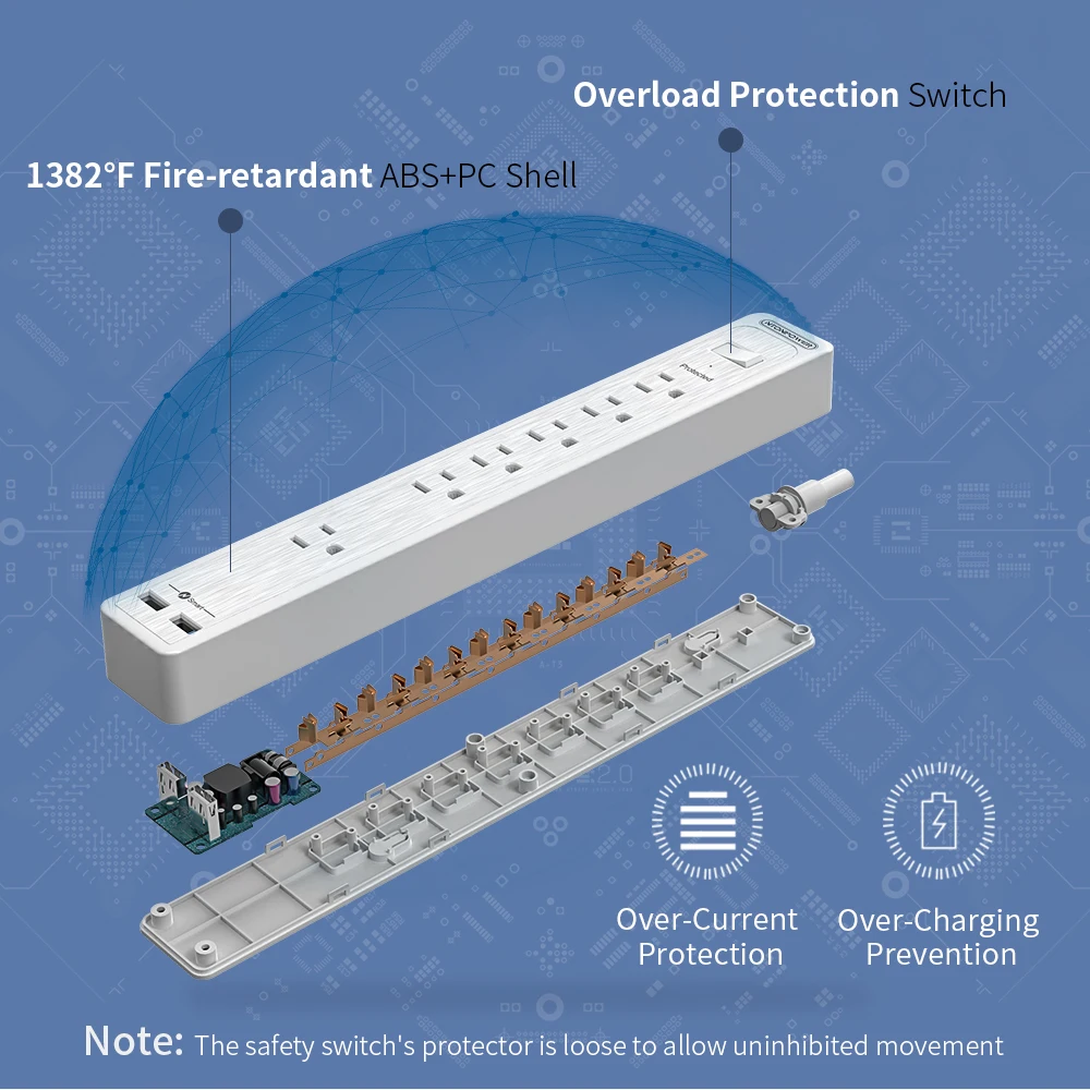 Множественное предохранение: 1 защита от перегрузки: при превышении номинального напряжения, все оборудование будет автоматически отключено для защиты вашего оборудования во всех сферах. 2 Защита от перенапряжения: обеспечивает 1080 Дж защиты от перенапряжения, давая вам больше душевного мира. 3. Вдали от пожароопасности, с 750 °C огнеупорный PC + ABS материал.
