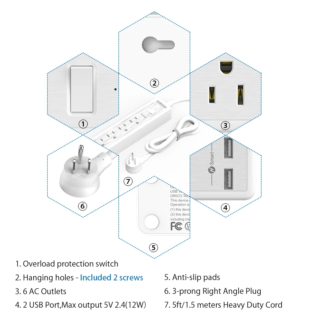 1. Компактный и тонкий дизайн, 6 портов переменного тока + 2 usb-порта, что обеспечивает идеальную универсальную зарядку. 2. Светодиодный индикатор: мягкий и не ослепительный. Пусть вас не разбудят огни ночью. 3. Он может быть установлен на стене, так что вы или ваш ребенок не будет путешествовать по нему. 4. Встроенная интеллектуальная зарядка IC, может обеспечить до 5V2.4A идеальный ток для одного порта; Всего 5V2.4A 12 Вт. 5. Вдали от пожароопасности, с 750 °C огнеупорный PC + ABS материал. Интегрированная медная конструкция и защитные ворота для детей обеспечивают большую защиту. 6. Сертифицировано CE, RoHS и DoE VI. 7,18 месяцев гарантии и пожизненная техническая поддержка.