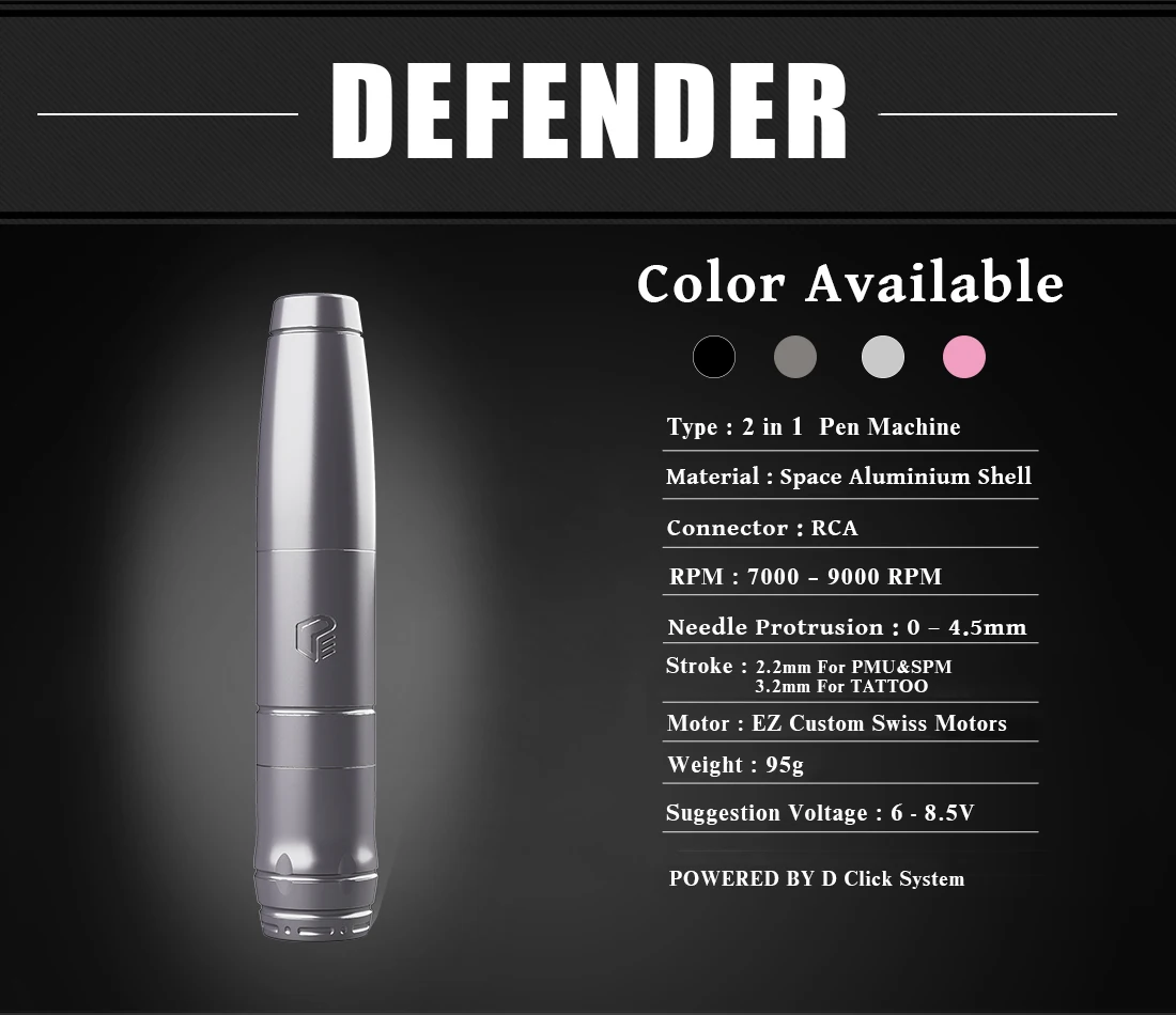 Работа от PMU до тату только в одной машине. Defender 2-в-1 поворотные ручки машины, с переключением между дальним и машину работать в течение более чем одна задача не теряя времени производства. Дополнительный ход 3,2 мм и 2,2 мм в настоящее время отображается на ухо защитник «2 в 1». В любое время вы работаете на нескольких работах, вы можете просто адаптироваться к ним с простым изменением идеального хода.