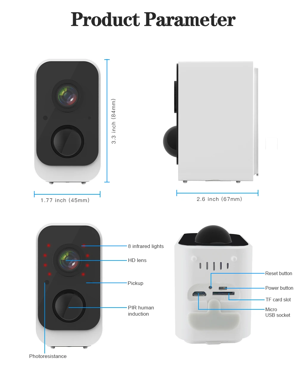 ● Без подключения проводки ● Низкое энергопотребление ● Обнаружение движения/инфракрасное ночное видение ● Беспроводной/двусторонний домофон/пульт дистанционного управления для телефона ● Широкий угол обзора 130 ° ● Хранение tf-карт/Облачное хранилище ● IP66 водонепроницаемый/многоместный просмотр