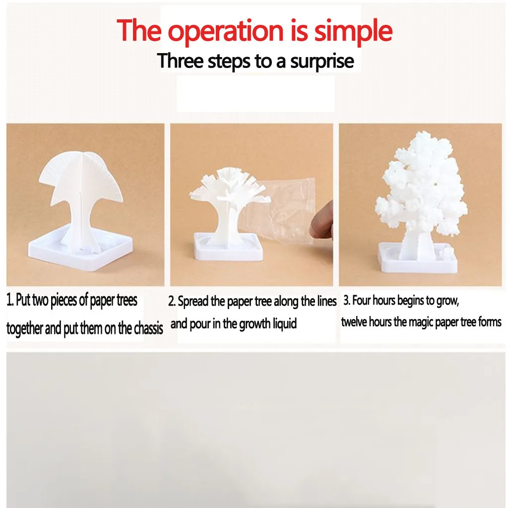 Соберите простое двухсекционное картонное дерево. Закрепите дерево на предоставленном пластиковом контейнере. Налейте волшебную воду в контейнер. И все. В течение нескольких часов на ветках деревьев начинают появляться цветные кристаллы... Установите это в канун Рождества с детьми. Вы и дети просто не поверите своим глазам, когда они Просыпайтесь в рождественское утро! Волшебное растущее дерево! Дозировка использования: лоток может быть заполнен водой, обычно 15 мл горячей воды, не используйте холодную воду, кристалл не любит жидкость может быть полностью растворена. (Лучше сделать это ночью с детьми, прежде чем они ложатся спать. Когда просыпаются утром, их дерево будет наполнено листьями :) Отличный сюрприз для маленьких детей.Теплые советы: