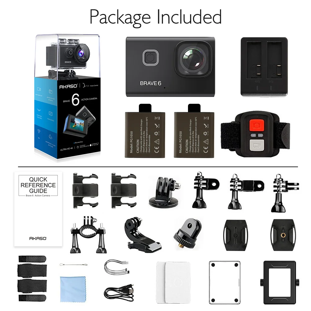 Серия обновлений AKASO BRAVE 4: 4K/24fps, 2K/30fps и 1080P/60fps видео разрешение и 20MP фотографии, экшн-камера AKASO Brave 6 позволяет снимать потрясающее видео в формате Full HD и уникальные видео с временными интервалами-идеально подходит для совместного использования. Голосовое управление: вы можете управлять вашей экшн-камерой AKASO Brave 6 без использования голосовых команд, таких как «AKASO Video Start» и «AKASO Take Photo». Улучшенная стабилизация изображения: Встроенная электронная стабилизация изображения (EIS) обеспечивает стабильное и плавное видео с разрешением до 4K/24fps, эта Спортивная камера обеспечивает отличный опыт в съемке быстро движущихся объектов. Дополнительный Угол обзора: угол обзора этой экшн-камеры может быть установлен между 170 °, 140 °, 110 ° и 70 ° в соответствии с вашими потребностями. Водонепроницаемая камера 98FT: оснащена водонепроницаемым чехлом, эта подводная камера может погружаться в глубину до 98 футов, готова запечатлеть все детали ваших приключений. Идеально подходит для водных видов спорта, таких как плавание, серфинг, дайвинг, Подводное плавание и т. д. Характеристики: Голосовое управление/электронная стабилизация изображения/зум 6x/регулируемый угол обзора/дистанционное управление/управление Wi-Fi/фото Burst/автотаймер/Время отключения видео/режим дайвинга/спецэффекты/Баланс белого/петля запись/режим вождения/Обнаружение движения/WDR/анти-тряска/аудио запись/Micro HDMI/ Micro USB Теплый совет: Samsung 64 Гб 100 МБ/с./с (U3) MicroSDXC Evo выберите карту памяти настоятельно рекомендуется для экшн-камеры AKASO Brave 6 4K (карта Micro SD не входит в комплект). Перед использованием этой экшн-камеры отформатируйте карту в камере. Что в коробке: 1 Экшн-камера AKASO Brave 6/1 пульт дистанционного управления 2,4G/2 аккумулятора 1050 мАч/1 водонепроницаемый чехол/1 велосипедная подставка/7x крепление/2x зажим/1 Крепление на шлем/1 повязка/5x Tethers/ 1x защитная задняя дверь/1x USB кабель
