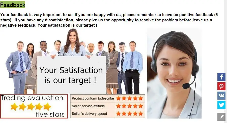 Наша продукция поставляется непосредственно с завода. Каждый продукт имеет контроль качества перед отправкой для обеспечения качества. Наши услуги и логистические перевозки делают все возможное, чтобы сделать все возможное. Ваше удовлетворение-наша главная цель. Если у вас есть какие-либо вопросы, пожалуйста, свяжитесь с нашей AliExpress службой поддержки клиентов, мы ответим вам как можно скорее. Мы сделаем все возможное, чтобы предоставить вам высококачественную продукцию и отличный сервис. Спасибо, что выбрали нас.