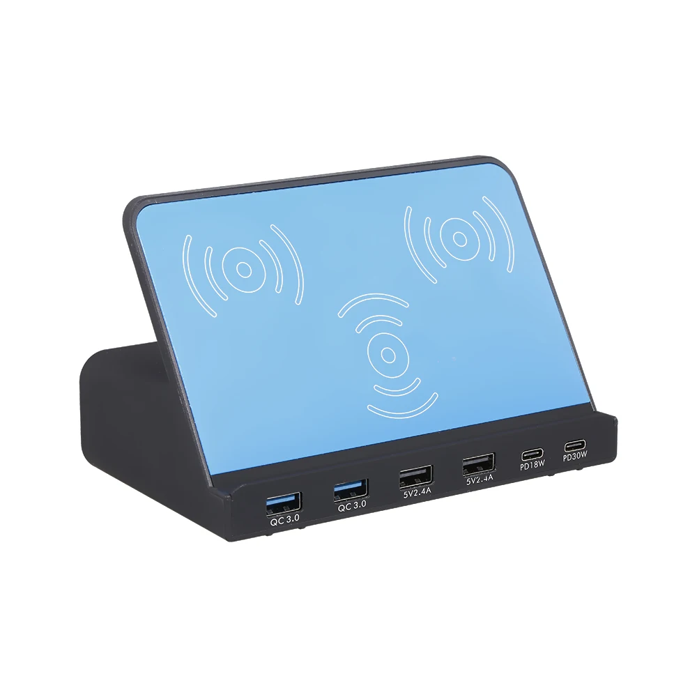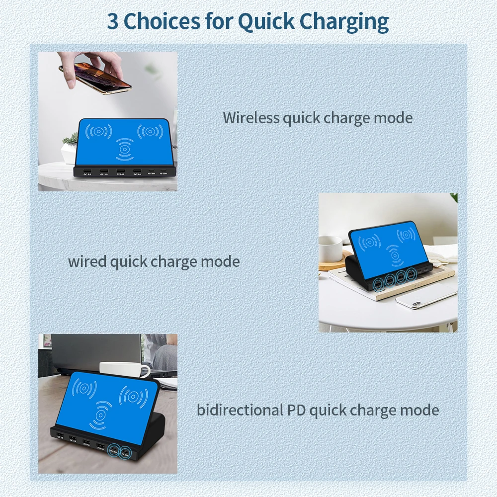 6 зарядных портов, USB + PD + QC3.0, быстрая зарядка и стабильный выход. 3 беспроводной выход QI поддерживает три устройства для зарядки. Множественная защита защищает зарядное устройство от повреждений. Конструкция кронштейна предотвращает падение телефона при зарядке, безопасно и удобно. Поддерживает автоматическую защиту от избыточного заряда, предотвращает перезарядку зарядного устройства и продлевает срок службы.![]()