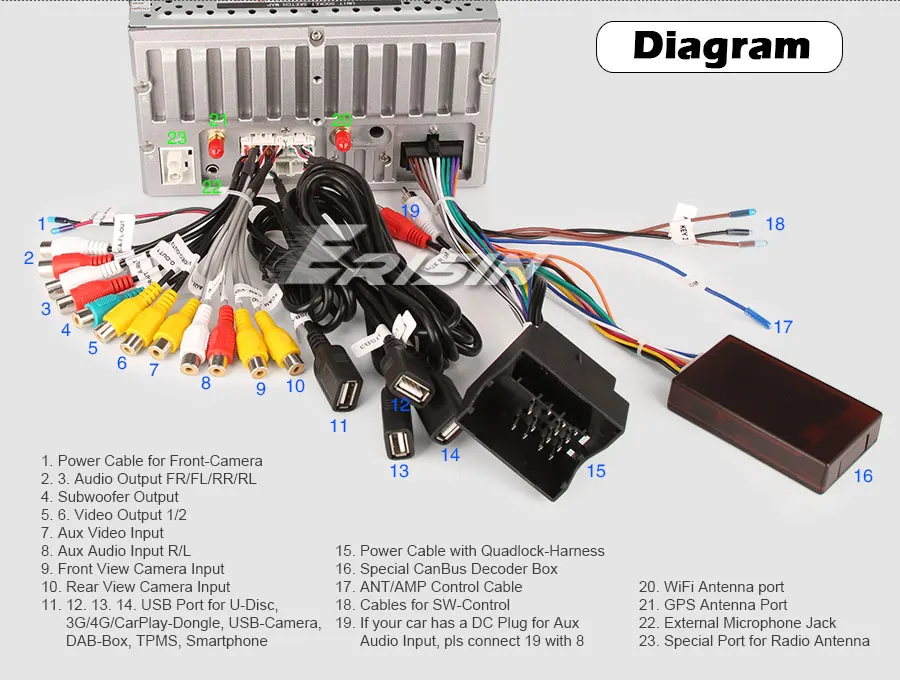 -Функция: может быть подключен к U-диску, ключу 3G/4G, ключу CarPlay, устройству TPMS, DVR-камере, DAB + Box, смартфону и т. д.