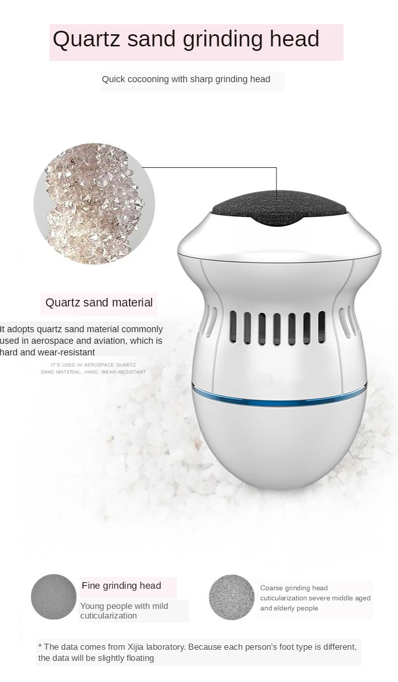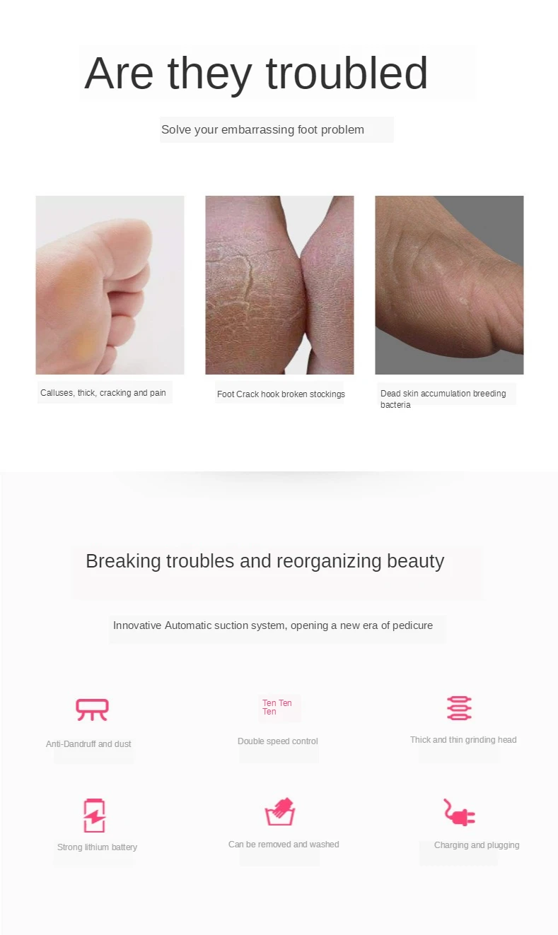 Применение: удаления мозолей функции, функцией массажа ноги, ноги функцией ремонта, каблук шлифовальный слой кутикулы. Вакуумная система поглощения. Быстро насаживающийся. Usb-кабель для зарядки.