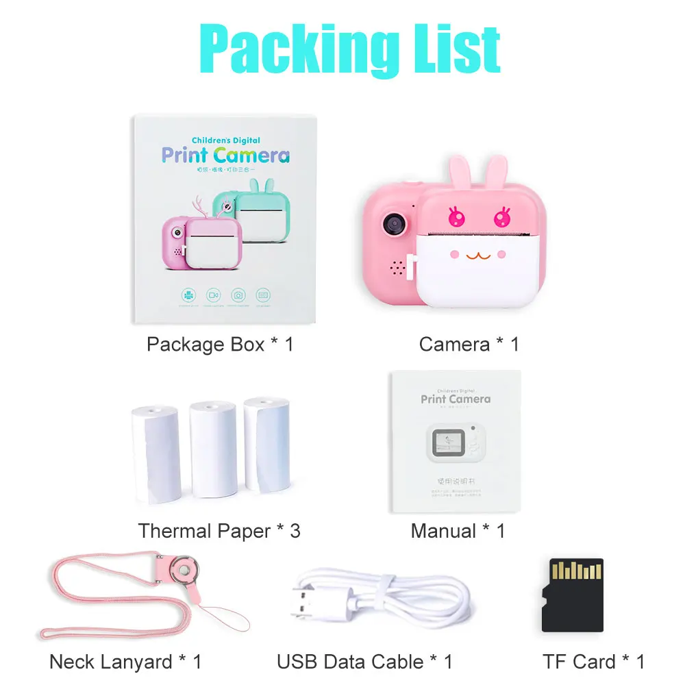 Камера x 1 Печатная бумага x 3 Руководство x 1 Ремешок x 1 Usb-кабель для передачи данных x 1 Tf-карта x 1