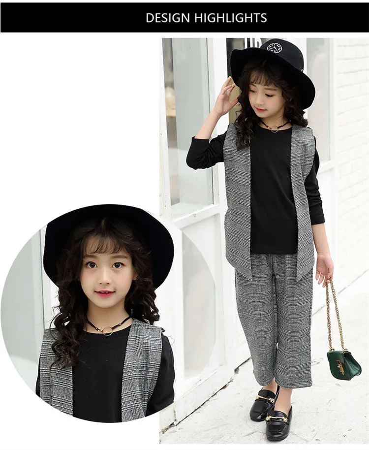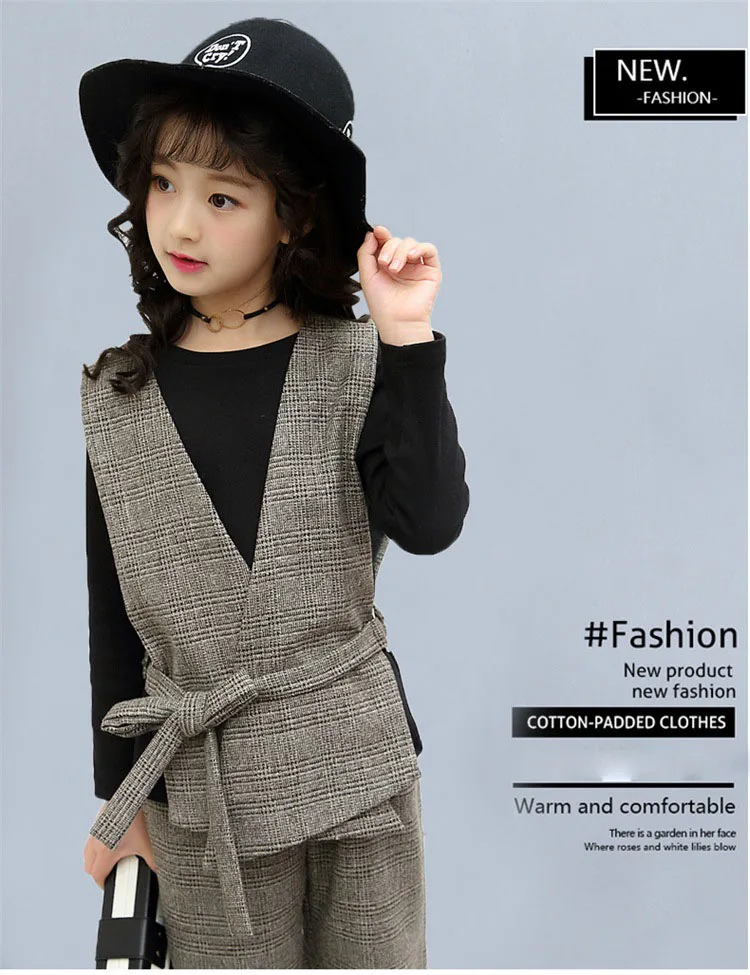 Комплект одежды для девочек-подростков, осенне-зимняя утепленная футболка, жилет, широкие штаны в клетку, детский спортивный костюм из 3 предметов, комплект для детей 8, 10, 12, 13 лет
