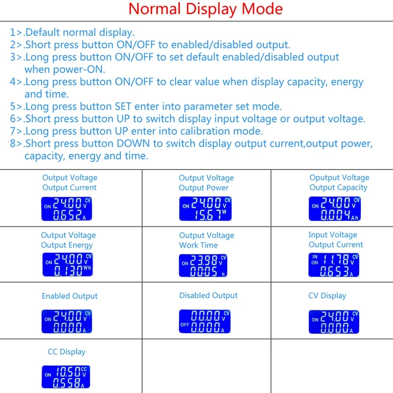 Инструкции по использованию: кнопка добавления: короткое нажатие для отображения входного/выходного напряжения, длительное нажатие для ввода интерфейса самокалибровки, нажмите кнопку SET, чтобы изменить параметры для калибровки (входное напряжение/выходное напряжение/выходной ток), настройка параметров коротким нажатием кнопки вверх/вниз. Нажмите кнопку SET, чтобы выйти из интерфейса калибровки.