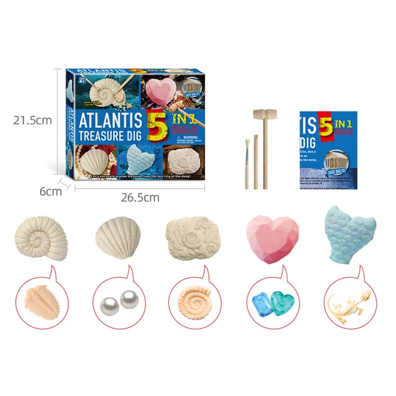 Our dig kits come with 5 relics individually wrapped and chisel, brush, hammer included. Use the tool to dig into the bricks to get the treasures out. Dig with our 5 in 1 Atlantis Treasure Kits, like a Real archaeologist! You 'll be going on an expedition to unearth the relics from the deep.