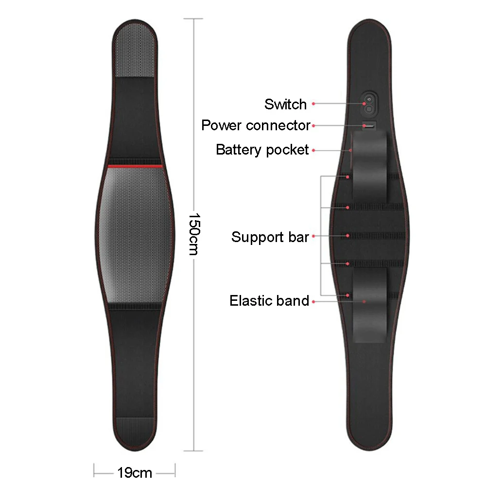 Массажер для талии Цвет: черный Длина: 150 см Ширина: 19 см Применение: длительное сидение, растяжения, поясничные боли Функция: горячий сжатие, вибрационный массаж, поддержка декомпрессии, поясничная поддержка