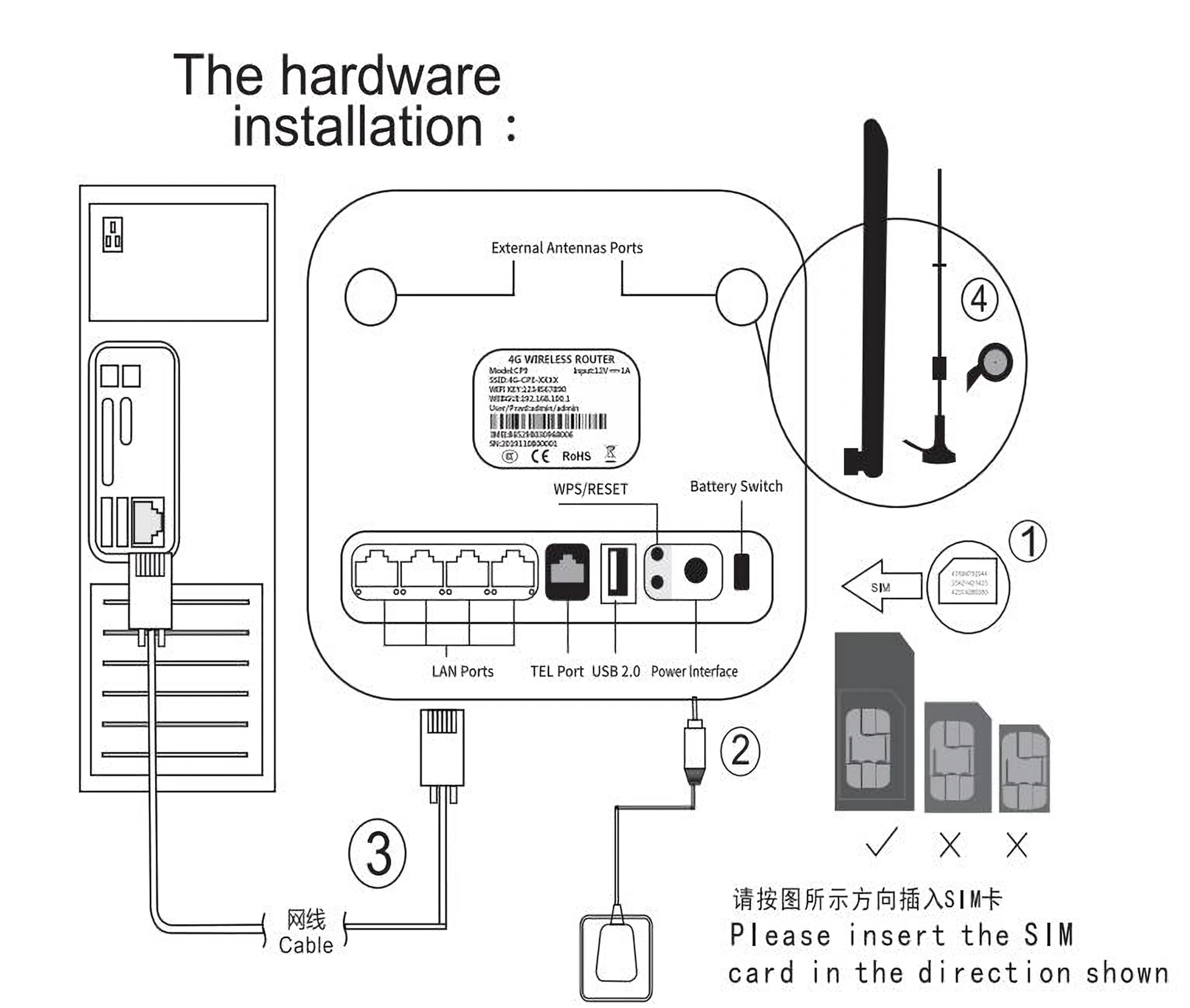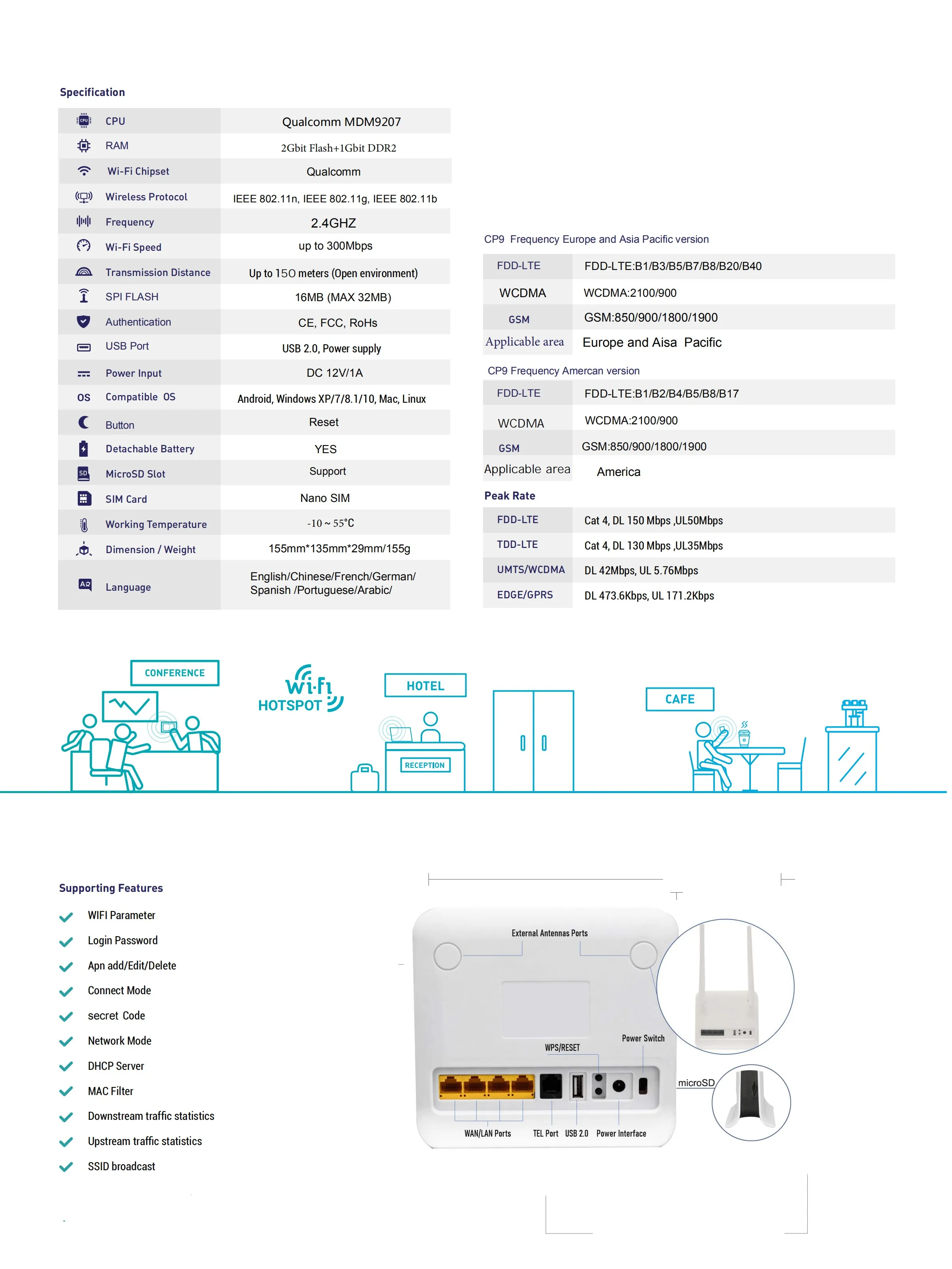 Советы по частотной полосе для модулей 3G или 4G, различные операторы в разных странах/регионах имеют различные Частотные полосы и частоты. Пожалуйста, сообщите мне диапазон или частоту. Затем мы можем выбрать подходящий модуль 3G или 4G. Перед размещением заказа, пожалуйста, подтвердите покупку частотного диапазона! Если вы не понимаете, вы можете проконсультироваться со службой поддержки клиентов 1. Поддержка сети 2G/3G/4G, диапазоны LTE могут быть настроены. 2. Набор микросхем Qualcomm MDM9207. 3. Поддержка WI-FI: 2,4 ГГц и 5,8 ГГц, WI-FI 2*2 MIMO, 802,11 a / b / g / n / ac 4. 4X 10/100/1000 гигабитный Ethernet порт. 5. Поддержка более 32 WIFI устройств онлайн одновременно .. Антенна Внутренняя антенна, поддержка 2x внешних антенных портов. 4G Main x1, 4G вспомогательный x1, WIFIx2; Внешние интерфейсы 1x порт питания постоянного тока: DC12V/1.5A; 4x10 Мбит/с/1000 Мбит/с LAN порт 1x 2FF стандартный слот для sim-карты Выбор диапазона частот Азия Тихоокеанская версия FDD-LTE :B1/B3/B5/B8 TDD-LTE :B38/B39/B40/B41 GSM :850/900/1800/1900 Европа и Aisa Тихоокеанская Америка FDD-LTE :B1/B3/B5/B7/B8/B20 TDD-LTE :B38/B39/B40/B41 GSM :850/900/1800/1900 Американская версия FDD-LTE:B2/B4/B5/B7/B12/B17 WCDMA:B2/B4/B5 GSM:850/900/1800/1900 Если вы не знаете Частотный диапазон 4G, используемый в вашей стране/регионе, пожалуйста, откройте следующий веб-сайт: //en.wikipedia.org/wiki/List_of_LTE_networks