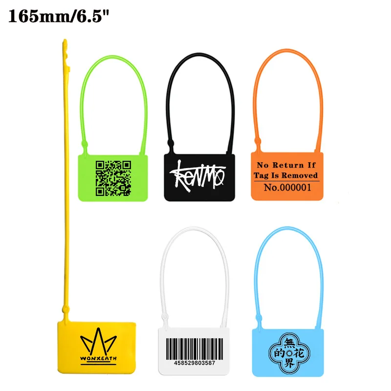 ➤Type: Disposable Plastic Brand Tags ➤Color: White; Yellow; Red; Black;Orange; Green; Blue; ➤Quantity: 100pcs/lot ➤Material: High quality PP raw material, not recycled material ➤Total Length: 165mm/6.5inches ➤Print area: 38mm*25mm(1.5inches*1.0inches) ➤Print Tech: Double-sided laser printing ➤Product Features: Fixed length; Once locked, can only be opened by scissor or knife.