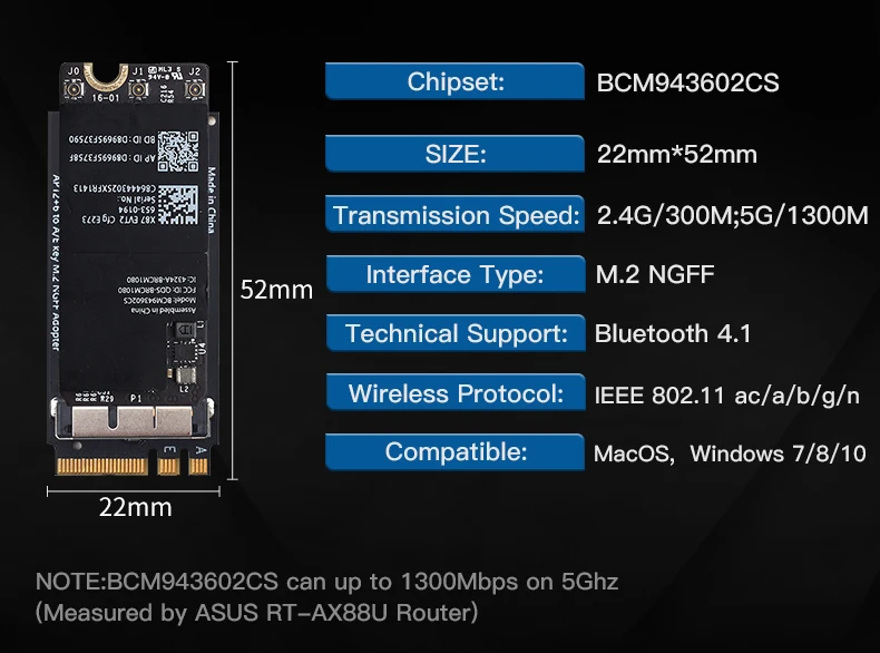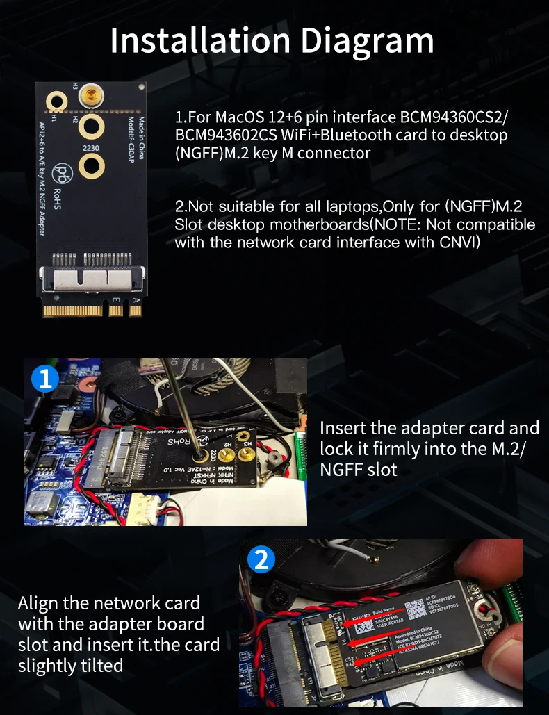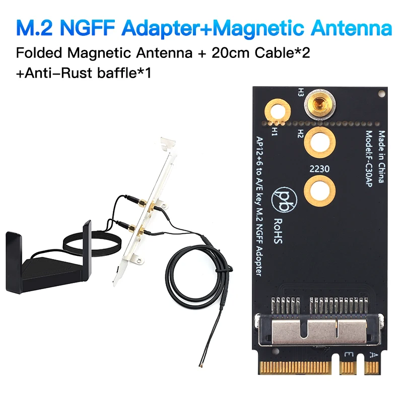 Подходит для настольных материнских плат с разъемом NGFF(M.2) key A/E, таких как Материнская плата Asus,MSI и GIGABYTE Z170 ITX series.