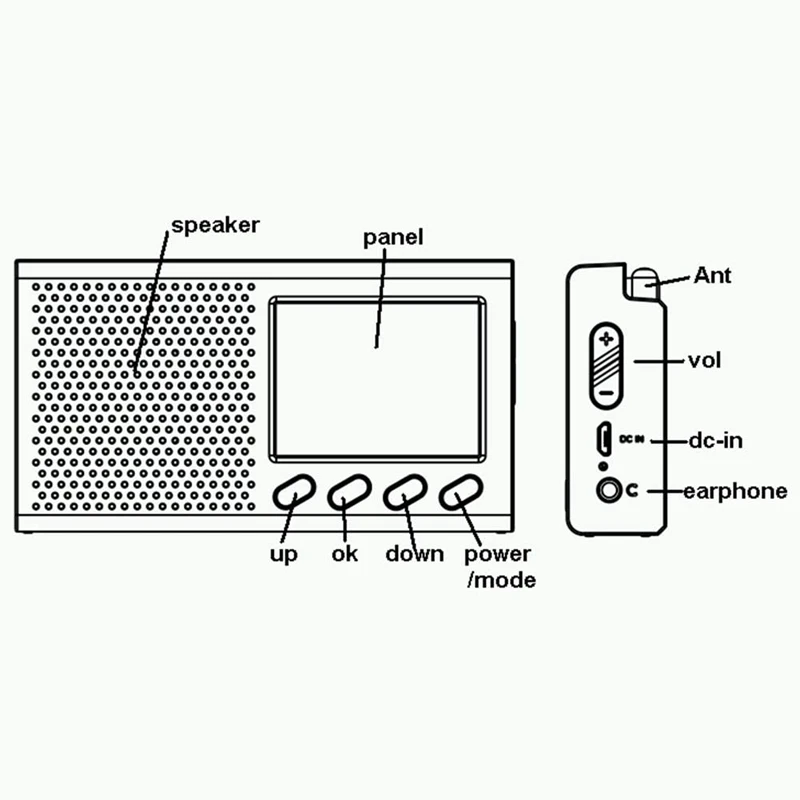 Температура: 0 градусов Цельсия ~ 45 градусов Цельсия Температура хранения: -20 градусов Цельсия-70 градусов Цельсия относительная влажность должна быть менее 80%(40 градусов Цельсия) в качестве хранения RH менее 95%(40 градусов Цельсия) разъем для наушников DC-in: 5 В dc-in: Подключите гарнитуру и звук выводится только из гарнитуры. Ant: телескопическая антенна. Vol: Настройка голоса Длительное нажатие Настройка любимых каналов или установка любимых каналов