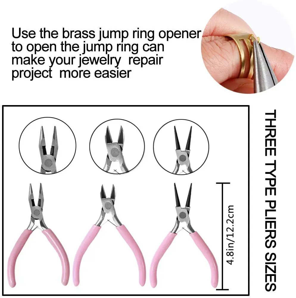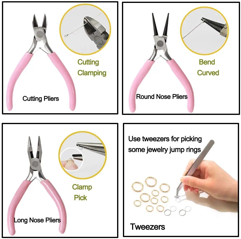 1. Стартовый Набор для изготовления ювелирных изделий включает в себя все, что вам нужно для ремонта ожерелья и браслета. 2. Режущие плоскогубцы используются для резки и зажима, плоскогубцы с круглым носом используются для сгибания, плоскогубцы с длинным носом могут использоваться для зажима и сбора. 3. Три типа инструментов для ремонта ювелирных изделий могут удовлетворить ваши различные требования в отношении проекта изготовления ювелирных изделий.