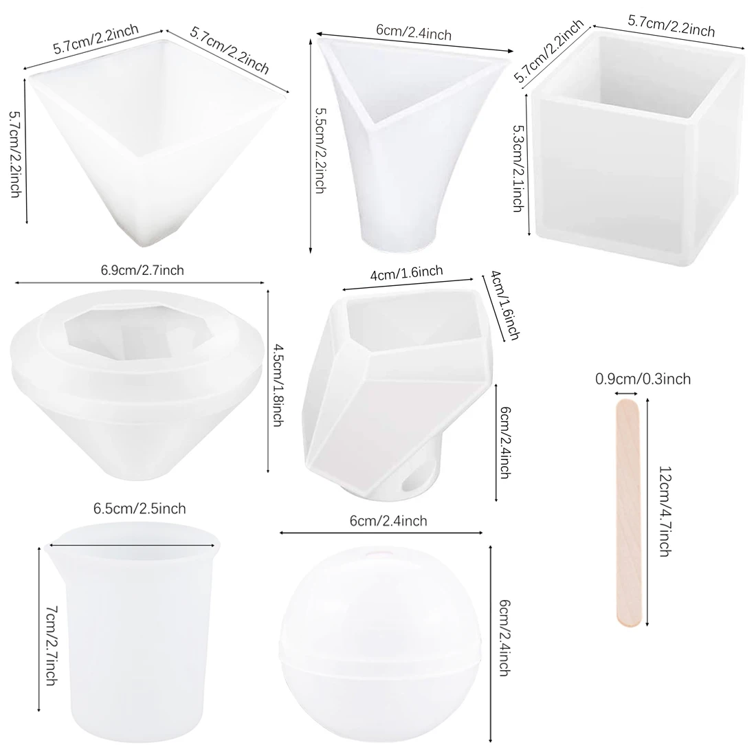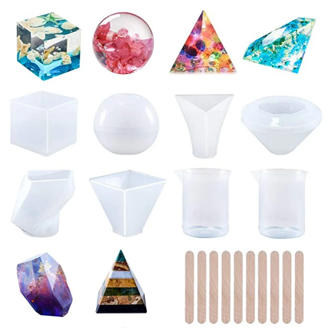 Посылка-набор форм из силиконовой смолы включает в себя 1 кубическую прессформу для смолы, 1 сферическую прессформу для смолы, 1 алмазную прессформу для смолы, 1 форму для смолы для пирамиды, 1 треугольную форму для смолы для пирамиды, 2 мерных стакана для смол, дополнительно 10 деревянных стержней для перемешивания.